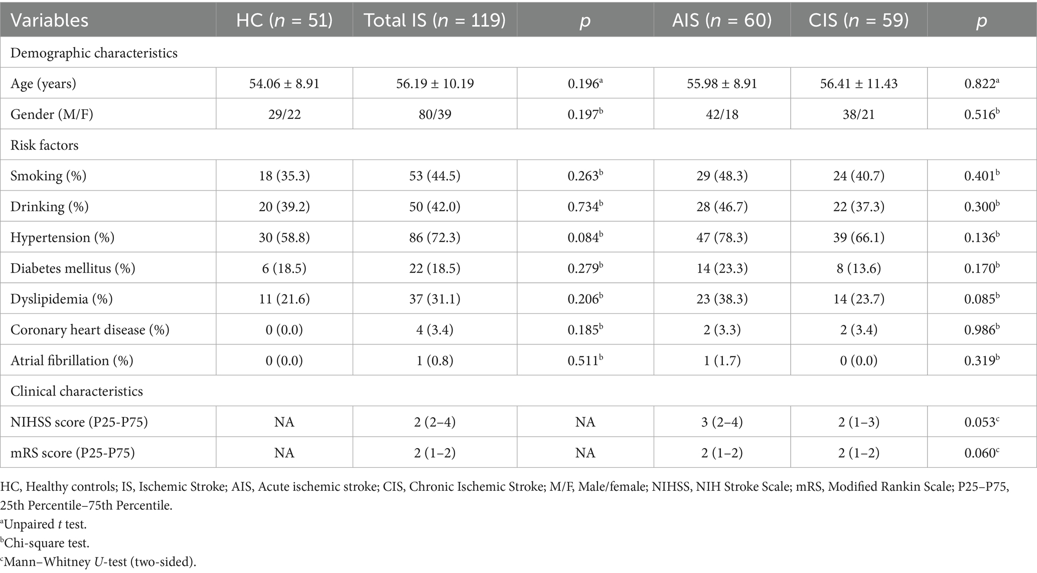 Participants diagnosed with IS at the First Affiliated Hospital of Guangxi Medical University from January 2019 to March 2025 were included in the study. IS was diagnosed according to the American Heart Association and American Stroke Association criteria (13) and confirmed by MRI or brain computed tomography. Acute/sub-acute (AIS) and chronic IS (CIS) were identified according to characteristic imaging features observed across various MRI sequences (14). Exclusion criteria were as follows: (a) severe aphasia and/or impaired consciousness that compromised the ability to understand and follow instructions; (b) a history of major systemic diseases, including severe cardiac, hepatic, or renal dysfunction, autoimmune disorders, or other psychiatric illnesses; (c) coexisting severe neurological disorders, such as brain tumors or traumatic brain injury, which could potentially confound the study outcomes; (d) contraindications to MRI scanning, or poor image quality that did not meet the requirements for analysis. The healthy control (HC) group was composed of 51 individuals with comparable demographic characteristics to the patient group and had received a thorough medical examination. The study procedures received approval from the Ethics Committee of the First Affiliated Hospital of Guangxi Medical University (2025-E0302), and informed consent was obtained from each participant.