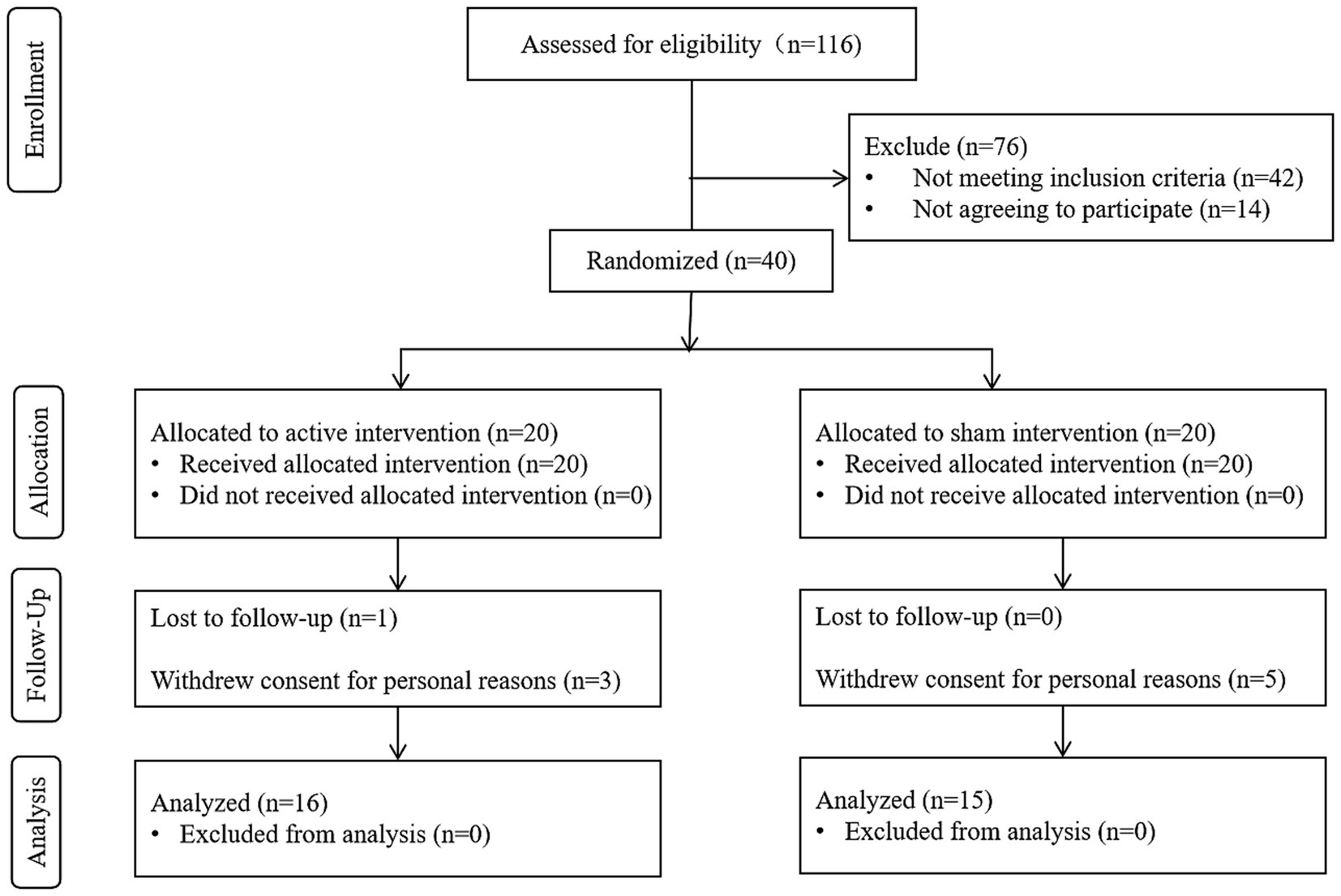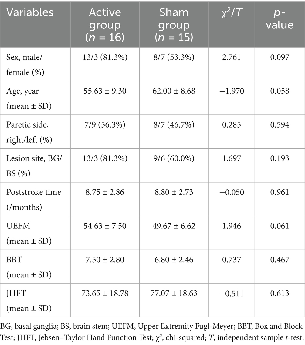 Thirty-one patients with chronic stroke recruited from Tianjin Union Medical Centre were included. A consort flow diagram is shown in Figure 1. The participants were randomly divided into an active group (n = 16) or a sham group (n = 15) using a random number table. The random allocation sequence was computer-generated by an independent statistician using MATLAB. A blocked randomization (block size of 4) was used to ensure a balanced group size throughout the recruitment period. The generated allocation sequence was concealed using sequentially numbered, opaque, sealed envelopes (11). The inclusion criteria of the patients were as follows: ① patients aged 50–70 years, ② patients with a first diagnosis of unilateral subcortical ischemic stroke based on magnetic resonance imaging (MRI) findings, ③ patients with chronic disease stage (>3 months and <12 months), ④ patients with mild or moderate impairment of upper limb function (Upper Extremity Fugl-Meyer Assessment [UEFM] score of 40–60), or ⑤ patients had normal cognitive function, as confirmed by a Montreal Cognitive Assessment (MoCA) score >25. The exclusion criteria of the patients were as follows: ① patients with a history of severe heart, liver, lung, kidney, and hematopoietic primary disease or epilepsy; ② patients with unstable cardiovascular and cerebrovascular diseases; ③ patients with visual analog scale score of the shoulder >4; ④ patients with severe upper limb dystonia and joint contracture deformity; ⑤ patients with metallic implants in the head, pacemakers, history of seizure or epilepsy, significant psychiatric conditions and other conditions which is not suitable for tDCS intervention as described by Antal et al. (12); ⑥ patients inability to commit to the full study protocol as determined during the initial screening interview, or failure to complete a preliminary compliance check session.