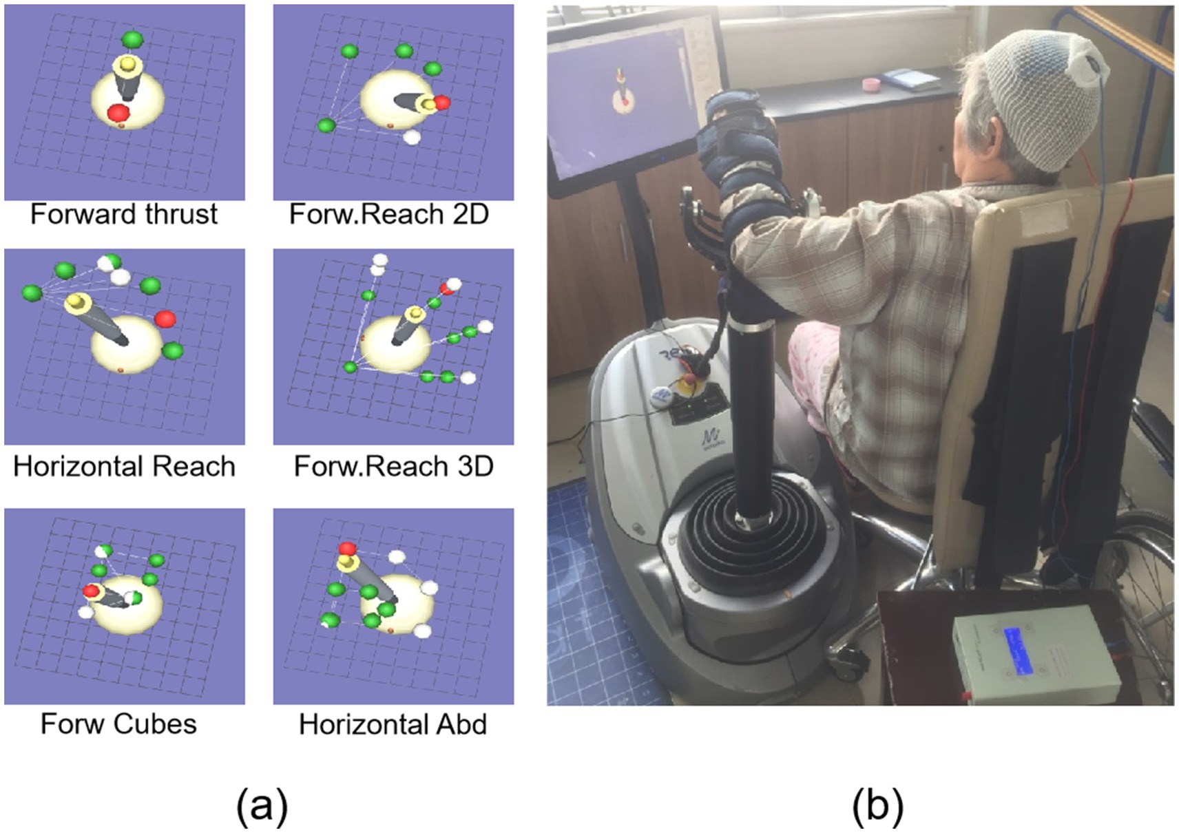 Figure 3. Trajectory of robotic motion (a) and combined treatment scene of cathodal transcranial direct current stimulation and robot training (b).