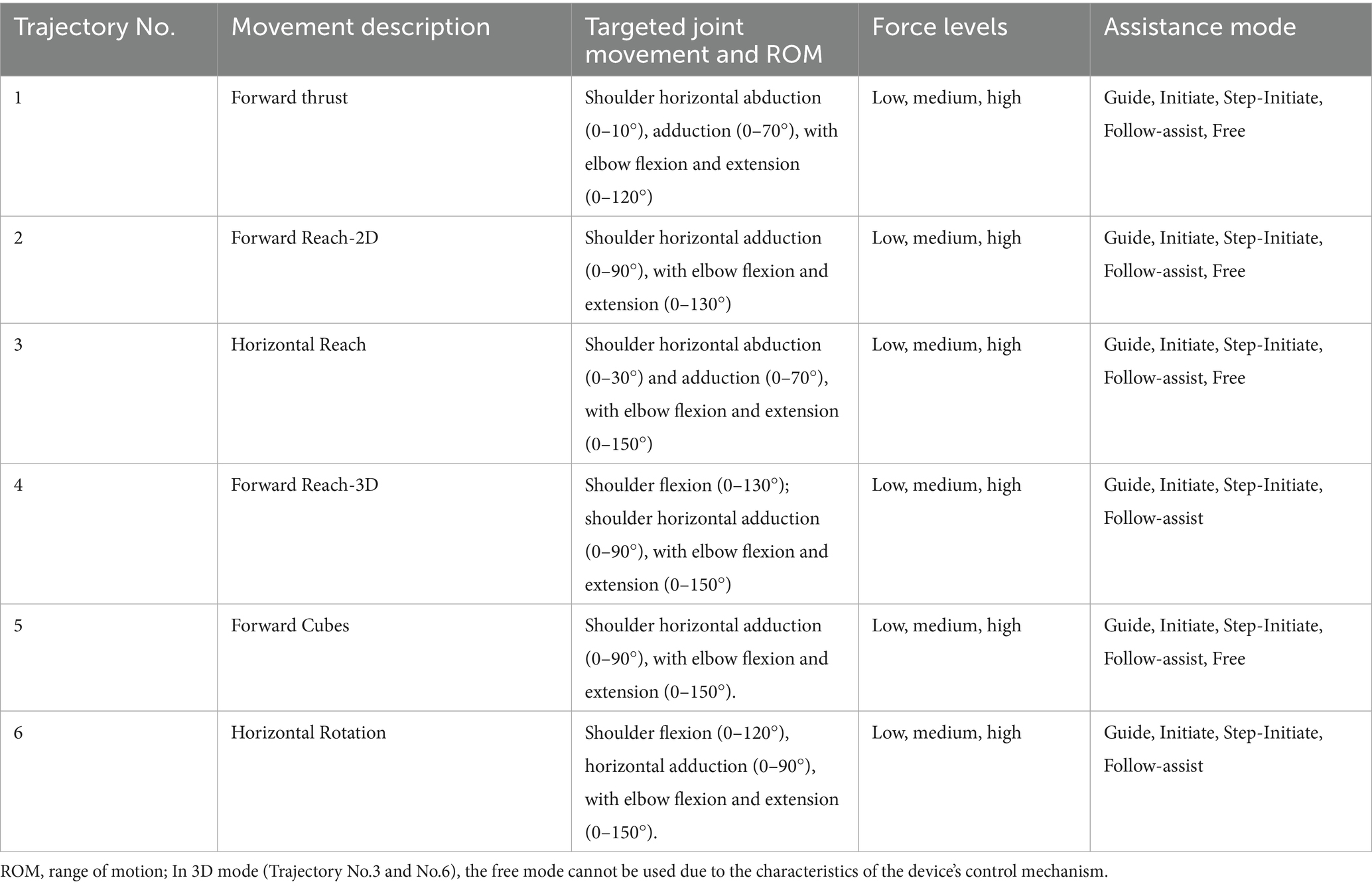 The RT protocol was conducted using an upper limb RT system (ReoGo, United States). The efficacy of this system in improving the UE function has been established in two RCTs (15, 16). The device consists of a telescopic arm with three-axis force-sensing technology, enabling it to support and guide the patient’s upper limb through movements in three-dimensional space. We selected six distinct motion trajectories designed to train functional movement patterns involving shoulder flexion/extension, abduction/adduction, and combined shoulder-elbow coordination (Figure 3). The device offers five training modes, which are selected by the therapist based on the patient’s residual motor capability: ① Guide: The robot moves the patient’s limb through the entire trajectory without any voluntary effort from the patient. ② Initiate: The patient must initiate movement by generating a minimal force threshold at the starting position; upon triggering, the robot completes the remainder of the movement. ③ Step-Initiate: The patient must voluntarily initiate movement and subsequently hit force thresholds at multiple points along the trajectory to complete the movement. ④ Follow-assist: The patient must provide continuous active effort to complete the movement. The robot provides a constant, adjustable level of assistance to compensate for weakness. ⑤ Free: The patient moves actively against adjustable resistance provided by the robot to strengthen muscles. The device has three force levels (low, medium, and high) representing the magnitude of resistance. The specific parameters for each trajectory and assistance mode are detailed in Table 1. The assistance level was set to provide minimal necessary support to complete the movement smoothly, while the resistance level in active mode was set to a level that allowed for 8–12 repetitions per set without compensatory movements. The range of motion was standardized to 90% of the patient’s available passive range to prevent discomfort or injury. Each RT session lasted 30 min.