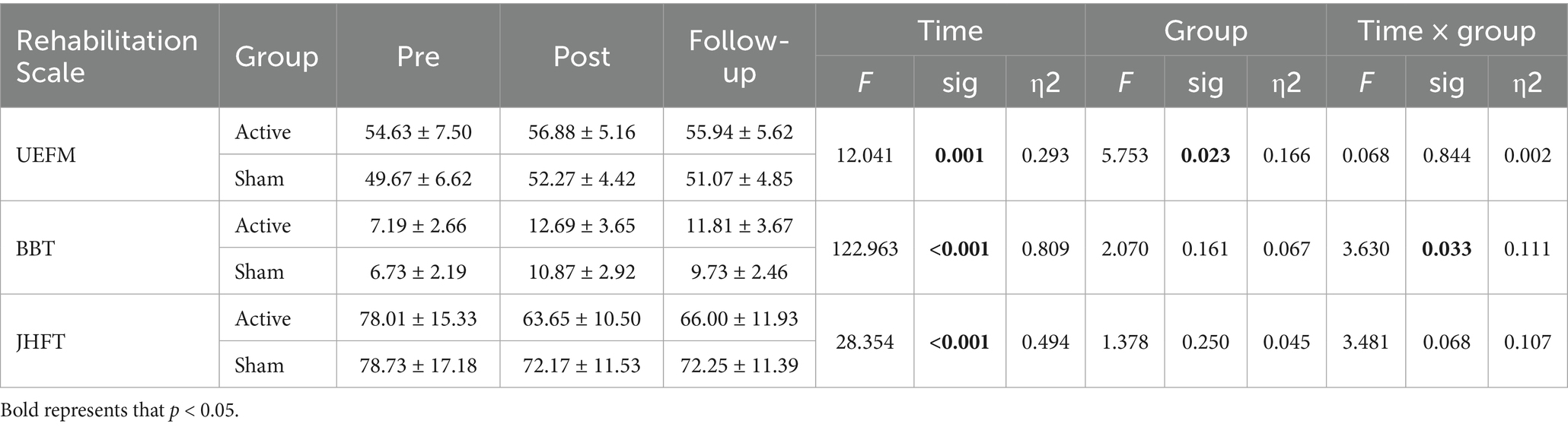 We used repeated measures analysis of variance (ANOVA) with time (three levels: pre, post, and follow-up) as the within-subject factor and group (two levels: active and sham) as the between-subject factor to evaluate the difference in the rehabilitation outcome measurement scale and robotic evaluation scale over the treatment and follow-up. Before the ANOVAs, Mauchly’s test of sphericity was used to test covariance matrix sphericity. If the spherical assumption was not satisfied, the Greenhouse–Geisser method was used to adjust the degree of freedom to reduce the probability of a type I error. A Bonferroni-corrected post hoc comparison was conducted after repeated ANOVA.