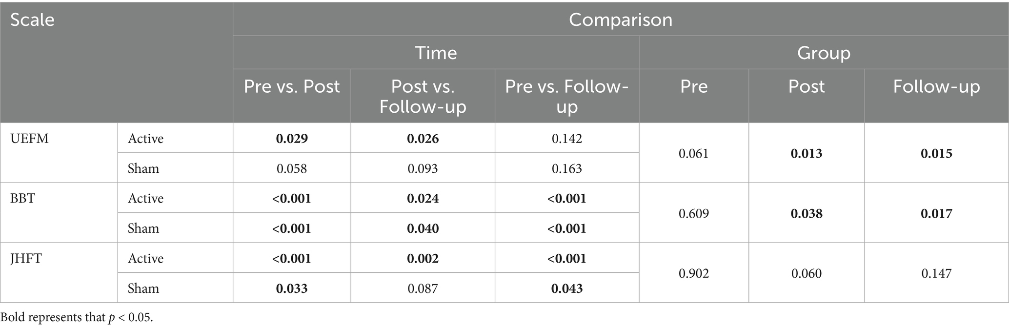 The results of the repeated measures ANOVA with time as the within-subject factor and group as the between-subject factor are presented in Table 3. It revealed significant within-subject improvements across time for all three rehabilitation scales: the UEFM, the BBT, and the JHFT (all p < 0.001). For between-subject effects, a significant difference was found only in the UEFM scores between the groups (p = 0.023). Furthermore, a significant time-by-group interaction was observed for the BBT scores (p = 0.033), indicating that the rate of improvement over time differed between the groups. The results of the post-hoc comparison are shown in Table 4. For UEFM, the between-group results showed that the UEFM scores were significantly different at post-treatment (p = 0.013) and follow-up (p = 0.015), and within-group results showed that the active group had a significant difference both post-treatment (p = 0.029) and at follow-up (p = 0.026). For the BBT, between-group results showed that BBT scores were significantly different at post-treatment (p = 0.038) and follow-up (p = 0.017), and within-group results showed significant pairwise differences at each of the three time point in both the active and sham groups.