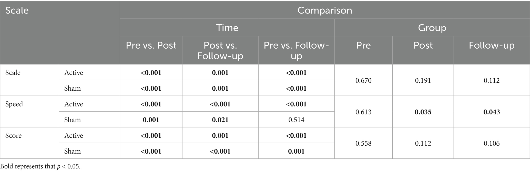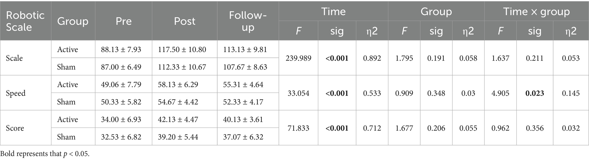 The results of the repeated measures ANOVA with time as the within-subject factor and group as the between-subject factor are presented in Table 5. The three robotic evaluation scales (scale, speed, and score) showed significant within-subject differences (p < 0.001). Only speed scale presented a significant interaction between time and group (p = 0.023). The results of post-hoc comparison are shown in Table 6. Post-hoc pairwise comparisons show significant pairwise differences at each of the three time point in both the active and sham groups, and only the speed was significantly different between groups at post-treatment (p = 0.035) and follow-up (p = 0.043).