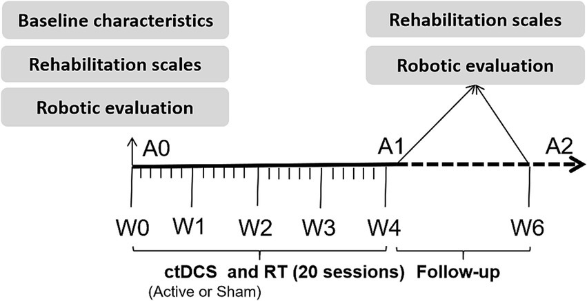 This was a randomized controlled trial comparing the efficacy of combined RT and active ctDCS versus RT plus sham ctDCS for improving upper limb function in stroke patients. Patients were randomly assigned (according to the random number table) to receive a total of 20 sessions during 4 weeks (1 session per day, 5 days/week) of active or sham ctDCS during upper limb RT. After each session, a questionnaire was administered to determine the patients’ symptoms (including prickliness, itching, burning, pain, headache, fatigue, inattention, and anxiety) (12) and degree (score ranging from 1 to 5) during the tDCS intervention. Additionally, the Borg Fatigue Assessment scale (6–20) was used to evaluate the patients’ degree of fatigue after RT. Patients were blinded to their group allocation (active or sham ctDCS). The therapists administering the tDCS could not be blinded due to the operational requirements of the device. However, the assessors who conducted all clinical and robotic evaluations were blinded to the group allocation throughout the study. Figure 2 shows the experimental protocol sequence.