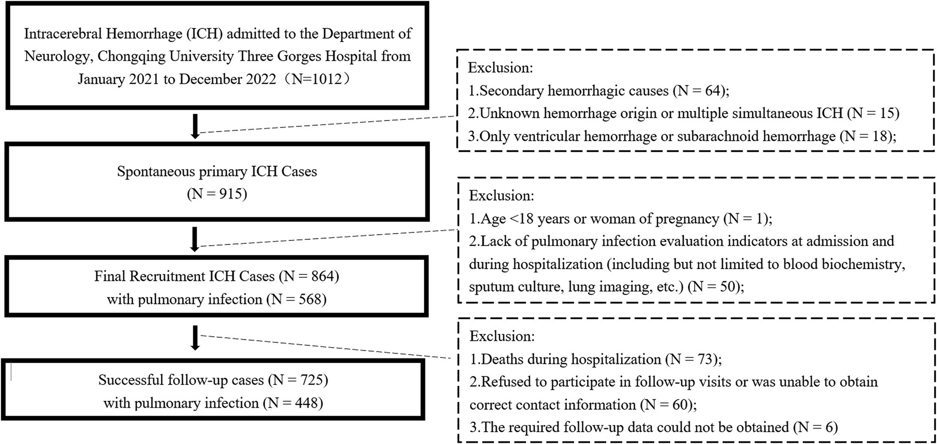 Flowchart depicting the selection process of intracerebral hemorrhage (ICH) cases at Chongqing University Three Gorges Hospital from January 2021 to December 2022. Initially, 1,012 cases were admitted. Exclusions for secondary causes, unknown origins, or specific hemorrhages reduced cases to 915 spontaneous primary ICH cases. Further exclusions based on age, pregnancy, and lack of pulmonary infection evaluation narrowed it to 864 cases, with 568 having pulmonary infections. Final successful follow-up included 725 cases, with 448 having pulmonary infections. Additional exclusions were due to deaths, refusal for follow-up, or missing data.