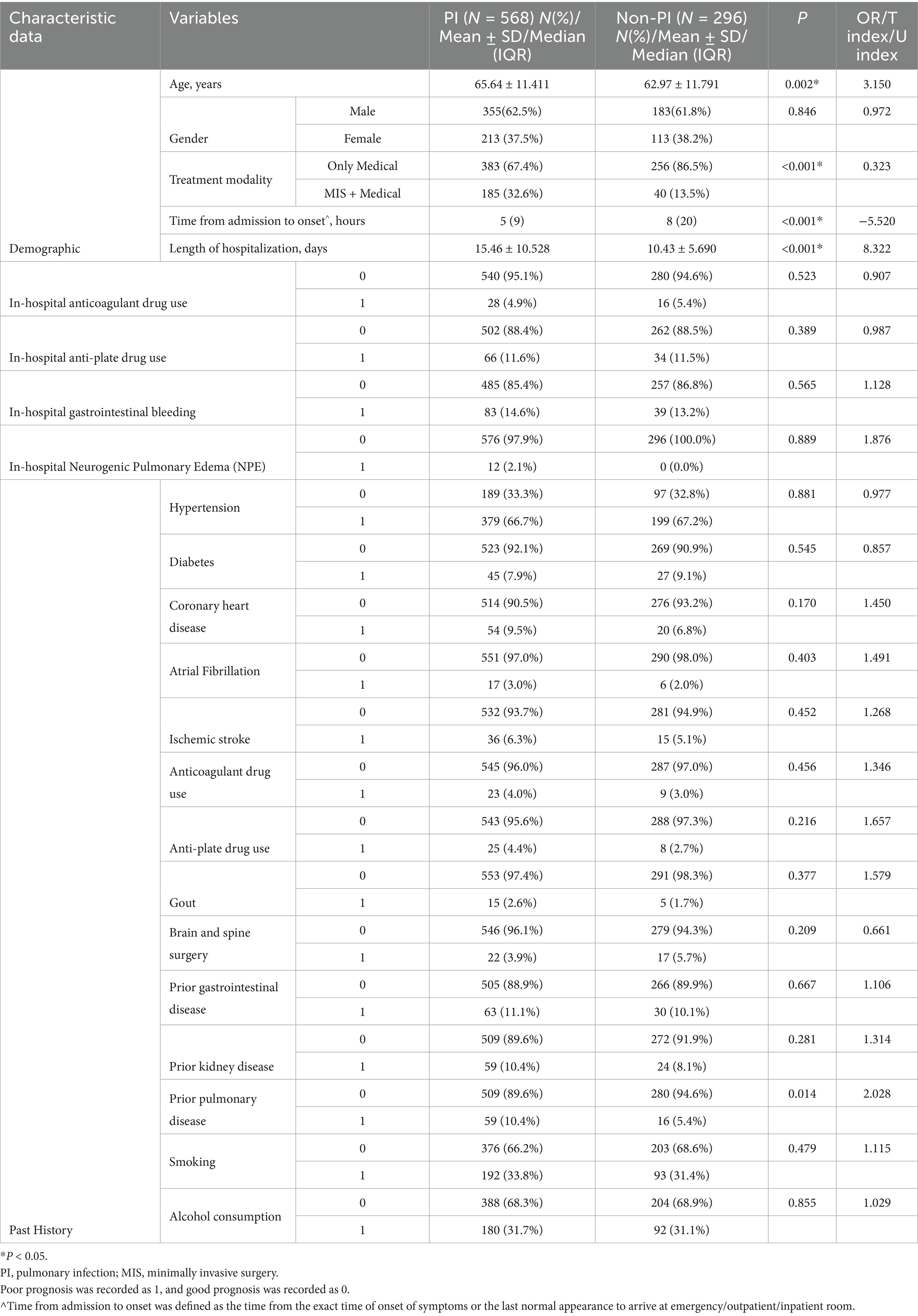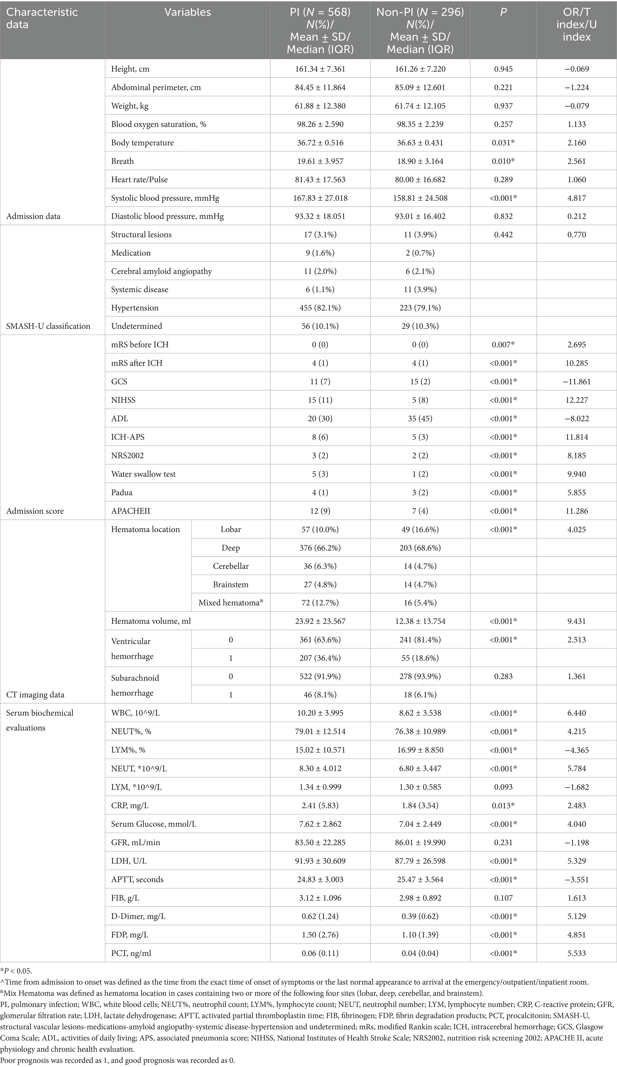 The PI assessment was based on previous diagnostic criteria (20, 21). At least two PI evaluations were performed (at the time of hospital admission and during hospitalization). Diagnosis requires the following evidence: imaging evidence (chest X-ray/CT) revealed inflammatory changes + ≥ 2 clinical criteria. Clinical criteria included: (1) respiratory symptoms such as cough and purulent sputum; (2) Auscultation suggested that both lungs had dry and wet rales, and/or signs of varying degrees of lung consolidation; (3) body temperature ≥38.5 °C and peripheral WBC count ≥10.0*109/L. It should also be specified that positive culture results are not required. Detailed PI examinations and assessments were performed on admission, during hospitalization, and before discharge for all included cases to avoid omissions as much as possible. PI does not specifically refer to stroke-associated pneumonia (SAP), and the time window is when pneumonia occurs at least 24 h after admission and pneumonia is excluded from being present at admission. All included patients underwent chest CT, blood routine and procalcitonin tests upon admission. At the same time, in accordance with the standards of the “Guidelines for the Diagnosis and Treatment of Community-Acquired Pneumonia (2019 Edition),” patients with pneumonia at admission were excluded from the study.