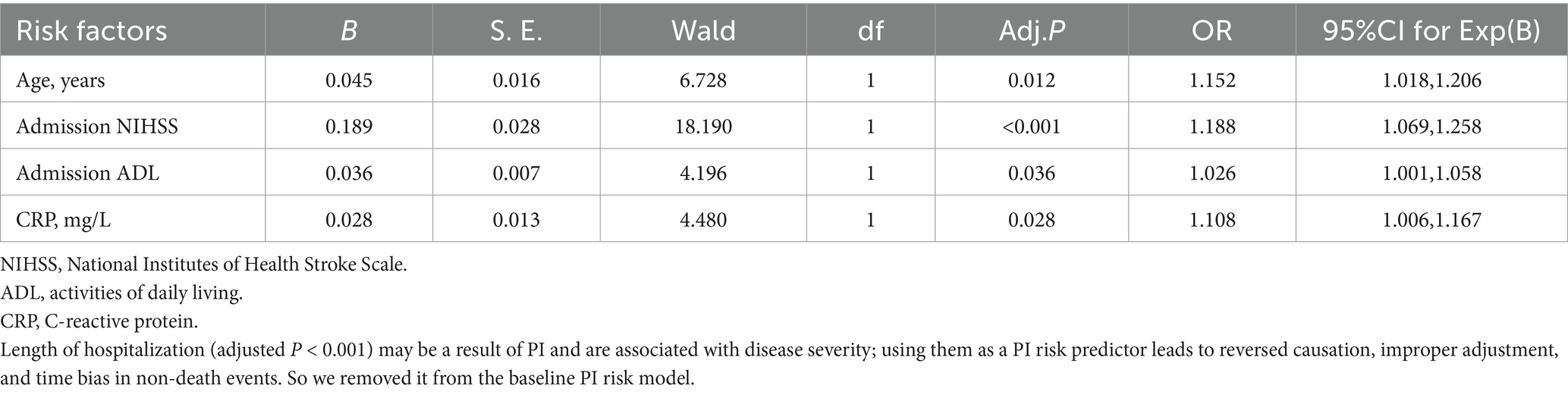 Independent risk factors associated with PI were identified based on multivariate analysis, including age (adjusted p = 0.008), length of hospitalization (adjusted p < 0.001), admission NIHSS score (adjusted p < 0.001), admission ADL score (adjusted p = 0.041), and CRP level (adjusted p = 0.034) (Table 3). Length of hospitalization may be a result of PI and are associated with disease severity; using them as a PI risk predictor leads to reversed causation, improper adjustment, and time bias in non-death events. So we removed it from the baseline PI risk model.