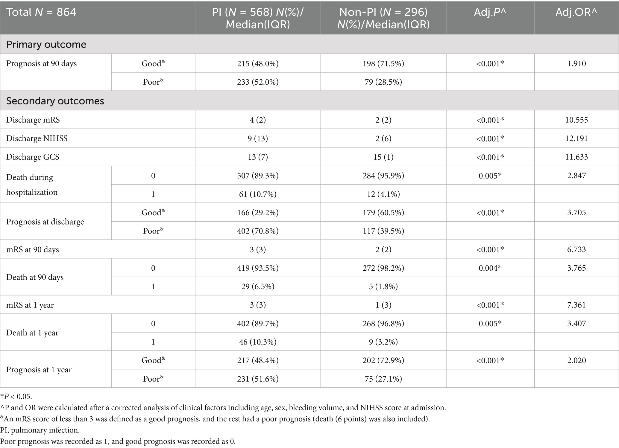 Ninety days after onset, the PI group had more deaths (adjusted p = 0.004) and worse prognosis (adjusted p < 0.001) than the non-PI group. In addition, there were differences in mRS score (adjusted p < 0.001) (Table 4).