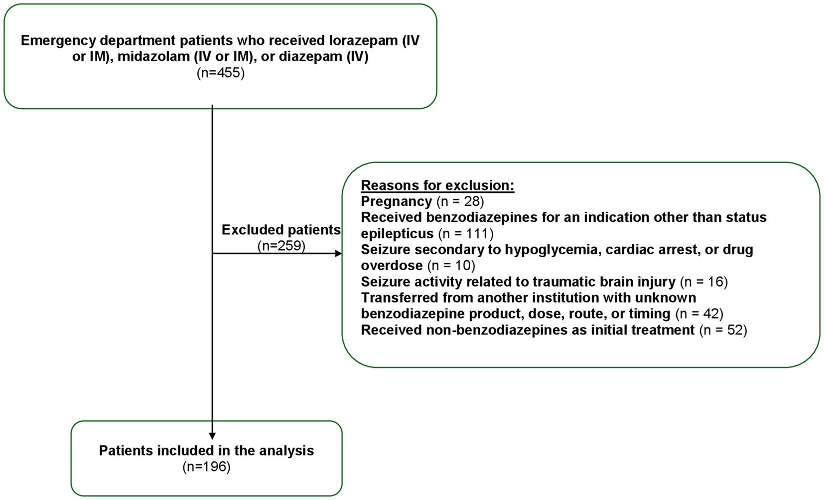 We conducted a single-center retrospective study assessing adult patients (≥18 years) presented to the ED with SE who received an initial dose of benzodiazepine (IV or IM lorazepam, IV or IM midazolam, or IV diazepam) between January 2021 and January 2024. We excluded patients with non-convulsive SE, as well as those who received benzodiazepine for an indication other than SE, such as those with seizures secondary to hypoglycemia, cardiac arrest, pregnancy, drug overdose, or a brain injury. Patients allergic to benzodiazepine or with incomplete medical records, as well as those transferred from another institution with an unknown benzodiazepine product, dose, route, or timing were also excluded (Figure 1).