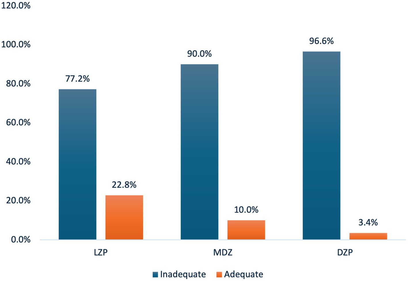 Figure 2. Percent of adequate first dose of benzodiazepine. LZP, Lorazepam; MDZ, Midazolam; DZP, Diazepam.