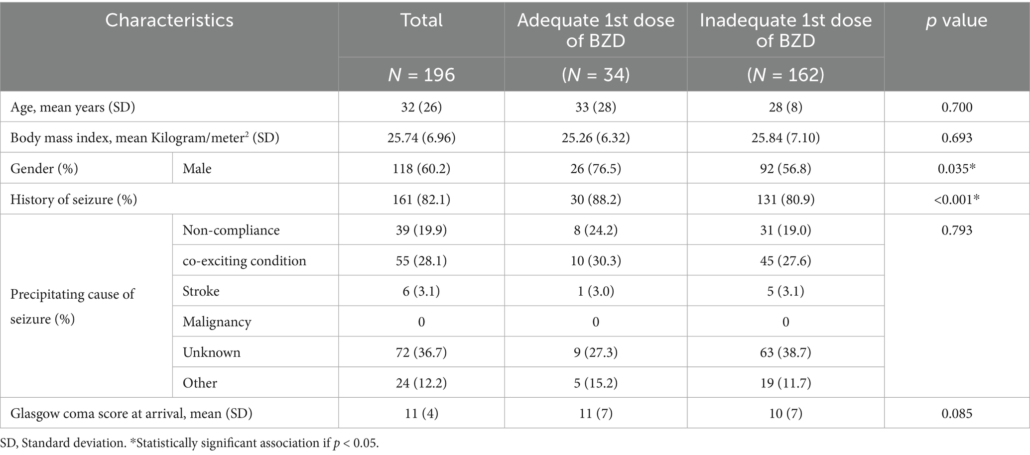 Among the 196 patients included in this study, 34 (17%) received an adequate first dose of benzodiazepine, while 162 (83%) did not (Table 1). Demographic analysis revealed the group to be predominantly male (60.2%) with a mean age of 32 years. The patients with history of seizure were significantly more likely to receive an adequate initial benzodiazepine dose (88.2% vs. 80.9%, p < 0.001). Other baseline characteristics–including the precipitating causes of seizures and Glasgow Coma Scale score at arrival–were similar between the two groups (Table 1).