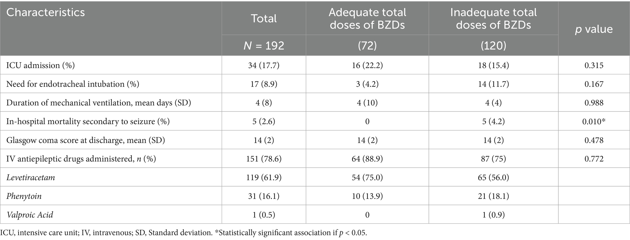 Results: Among 196 adult patients included, only 17% (n = 34) received an adequate first dose of BZDs. Pre-hospital BZD administration occurred in 5% of cases. Lorazepam was most frequently administered (65%), followed by midazolam (20%) and diazepam (15%). Inadequate dosing rates were 77.2% for lorazepam, 90.0% for midazolam, and 96.6% for diazepam. Following first dose of BZE, the overall need for endotracheal intubation rate was 8.7% and in-hospital mortality at 3.1% across the entire cohort, with no significant differences between the 2 groups (p = 0.166; p = 0.279). The overall need for endotracheal intubation rate was 8.9%, with no statistically significant difference observed between the groups (p = 0.167). For patients requiring mechanical ventilation, the mean duration was 4 days (p = 0.988). Notably, inadequate total BZD dosing was significantly associated with increased in-hospital mortality (4.2% vs. 0%, p = 0.010).