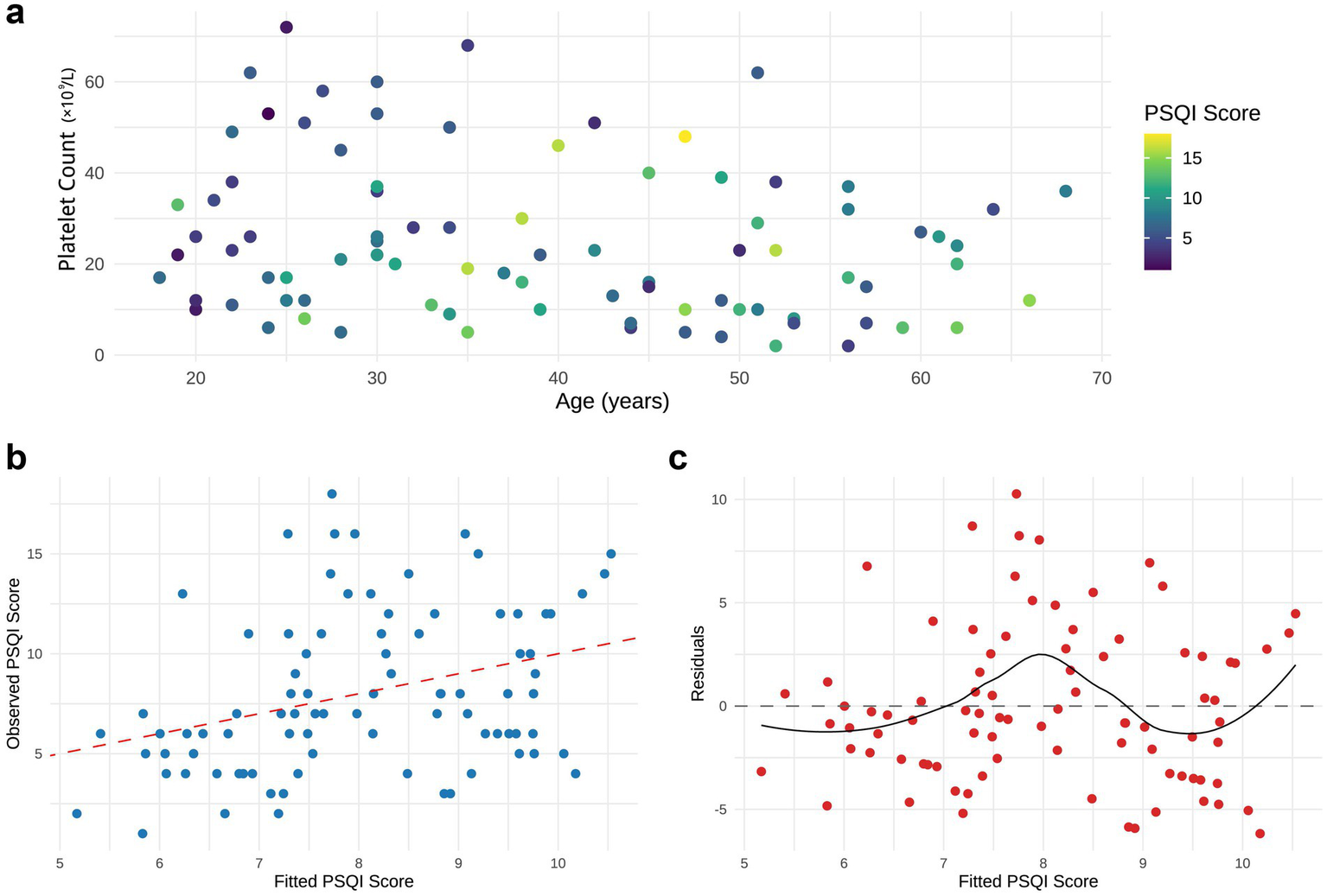 Linear analysis of age, platelet count, and sleep quality scores in ITP Patients. (a) Two-dimensional scatter plot of age versus platelet count, with point colors representing PSQI total scores (darker colors indicate poorer sleep quality). (b) Regression plot comparing observed PSQI scores with model-fitted values. (c) Residual plot of the model. All plots were generated using data from n = 87 ITP patients.