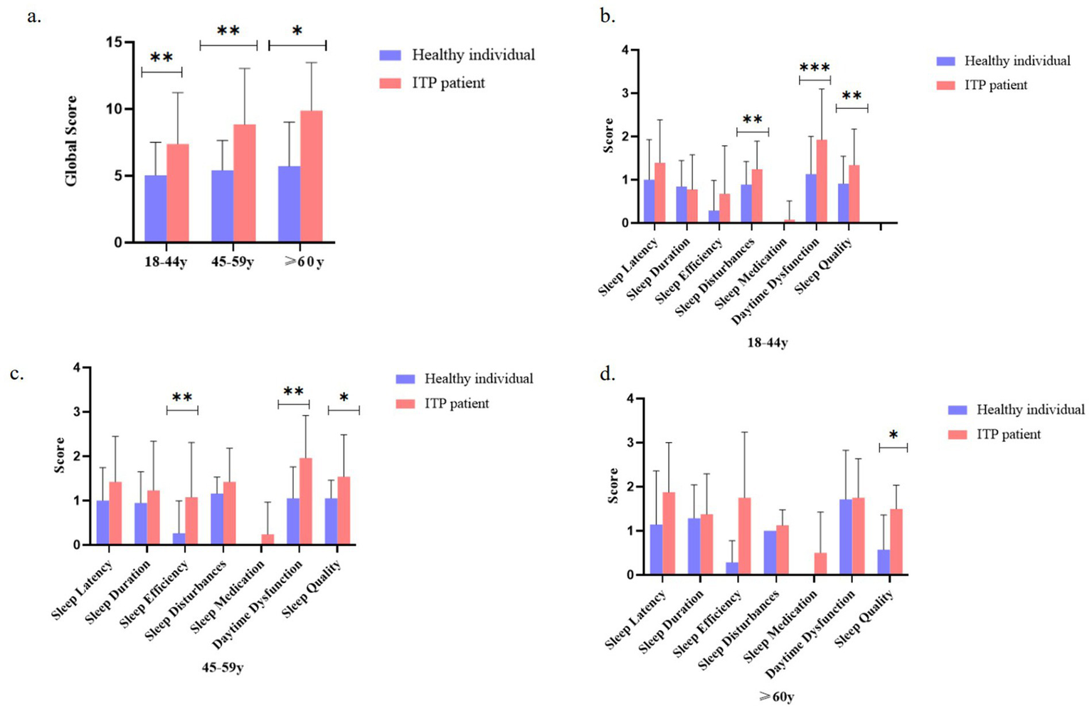 Age-stratified comparison of sleep quality metrics between ITP patients and healthy controls. (a) Comparison of global sleep quality scores between ITP patients and controls across age groups (18–44, 45–59, and ≥60 years). (b) Component-wise sleep parameter comparisons (sleep latency, duration, efficiency, disturbance, medication use, daytime dysfunction, and subjective quality) for 18–44-year-old ITP patients versus age-matched controls. (c) Same sleep parameter comparisons for the 45–59-year-old group. (d) Comparative analysis for the ≥60-year-old group. The study included 87 ITP patients analyzed by age stratification. Statistical significance was determined using t-tests and ANOVA, with asterisks denoting significance levels: *p < 0.05, **p < 0.01, and ***p < 0.001. Error bars represent standard deviation.