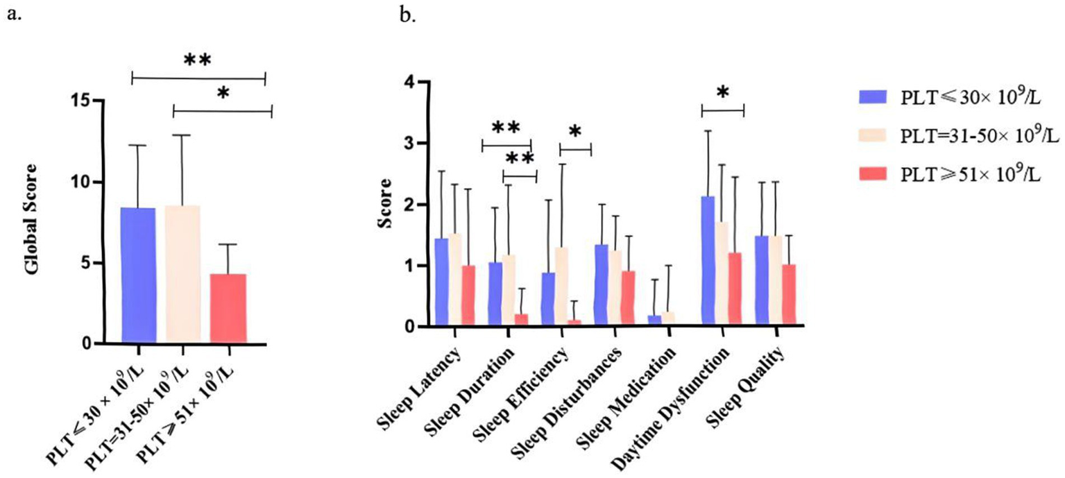 Sleep quality scores across platelet count subgroups in ITP Patients. (a) Global sleep quality scores of ITP patients stratified by platelet count (PLT ≤30 × 109/L, PLT = 31–50 × 109/L, PLT >50 × 109/L). (b) Component-wise scores for specific sleep parameters (sleep latency, duration, efficiency, disturbance, medication use, daytime dysfunction, and subjective quality) across subgroups. The analysis included 87 ITP patients. Statistical significance was determined by t-tests and ANOVA (*p < 0.05 and **p < 0.01). Error bars indicate standard deviation.
