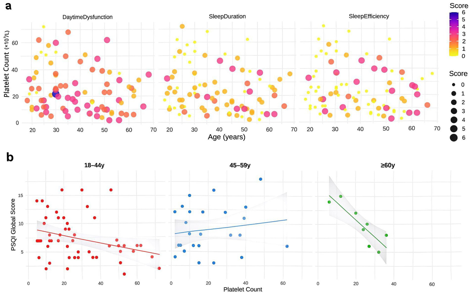 Analysis of platelet count and age effects on sleep parameters in ITP patients. (a) Scatter plots demonstrating joint effects of platelet count and age on sleep duration, efficiency, and daytime dysfunction scores. Point size reflects score intensity, with darker colors indicating worse scores. (b) Linear regression of platelet count versus PSQI total scores across age subgroups, with shaded 95% confidence intervals. Analyses were performed using data from 87 ITP patients.