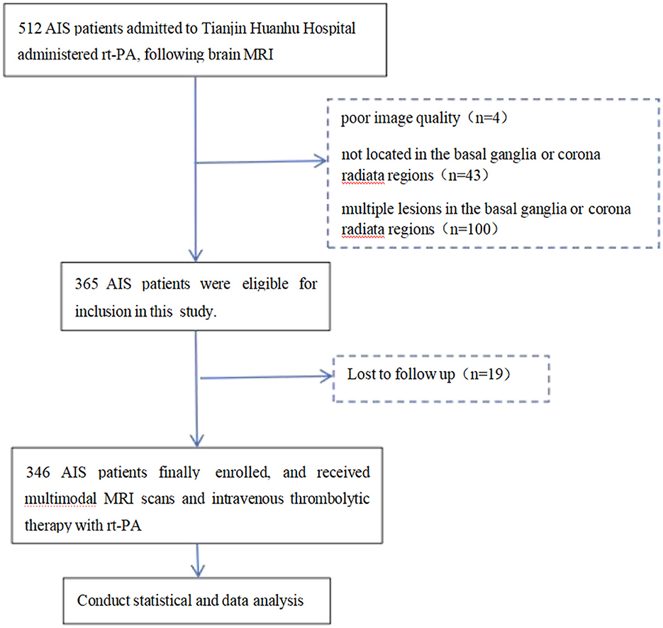 Based on the inclusion and exclusion criteria, a total of 512 patients with AIS were initially included in this study. All patients underwent Brain MRI followed by IVT with rt-PA. Among them, 100 patients were excluded due to multiple lesions in the basal ganglia or corona radiata regions, four patients were excluded due to poor image quality caused by motion artifacts or incomplete sequences, 43 patients were excluded because the lesions were located outside the basal ganglia or corona radiata regions, and 19 patients were excluded due to loss to follow-up at 90 days. Ultimately, 346 patients were eligible for the study. The flow chart of the selection of AIS patients is displayed in Figure 1.