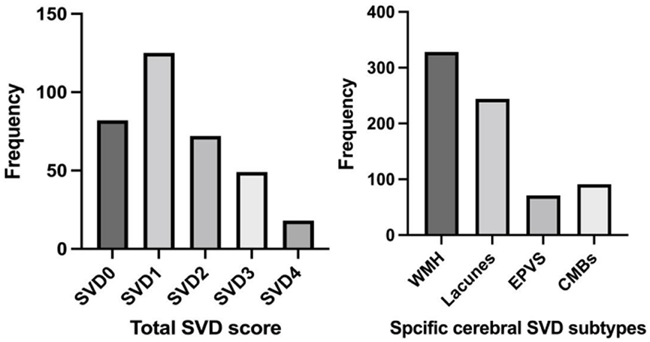 Figure 2. Distribution of SVD burden and subtypes. N for SVD 0 = 82; N for SVD1 = 125; N for SVD2 = 72; N for SVDD3 = 49; N for SVD4 = 18. WMH, White matter hyperintensities; EPVS, Enlarged perivascular spaces; CMBs, Cerebral microbleeds; SVD, Small vessel disease. N for WMH = 328; N for Lacunes = 244; N for EPVS = 71; N for CMBs = 91.