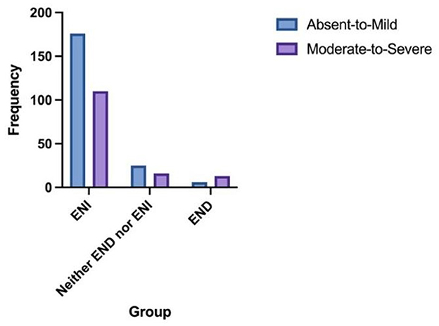 Figure 3. The distribution of 24-h early neurological outcomes according to the SVD burden. Absent-to-mild N for ENI = 176; N for neither END nor ENI = 25; N for END = 6. Moderate-to-severe N for ENI = 110; N for neither END nor ENI = 16; N for END = 13.