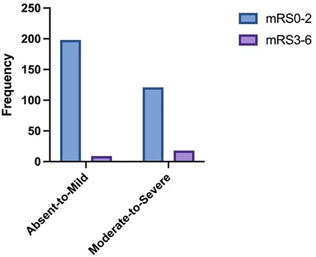 Figure 4. The distribution of 90-day mRS scores according to the SVD burden. Absent-to-mild N for mRS 0–2 = 198; N for mRS 3–6 = 9. Moderate-to-severe N for mRS 0–2 = 121; N for mRS 3–6 = 18.