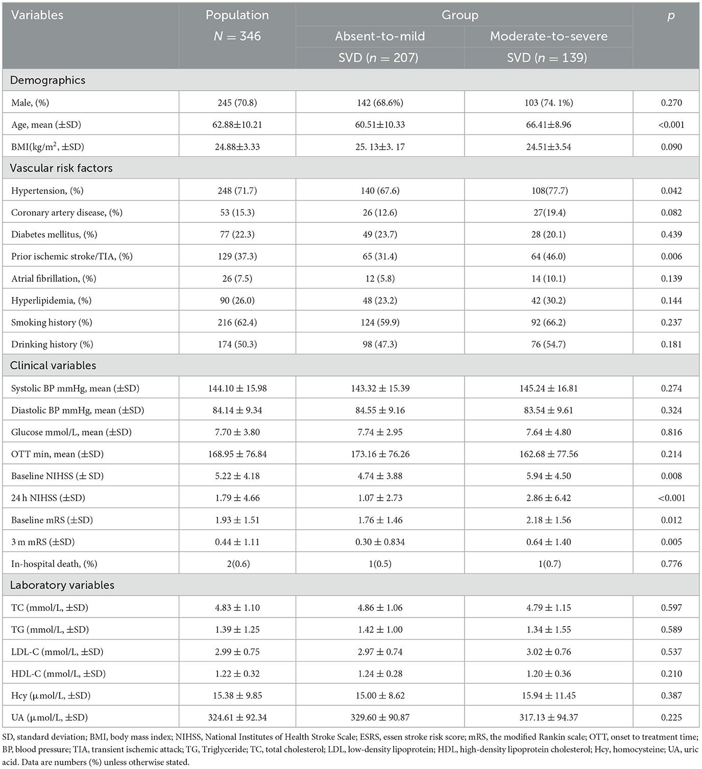 After the imaging assessment, the severity of SVD was evaluated for all participants using a score that ranged from 0 to 4, assigning one point for each of the following conditions: (1) severe WMH (Fazekas grade 2 or 3); (2) ≥ 1 lacune; (3) moderate-to-severe EPVS (≥ 10 in basal ganglia or centrum semiovale); (4) ≥ 1 CMBs (16). Based on the clinical cutoff values for SVD severity proposed by Wang et al. (19), the 346 patients were categorized into two groups according to their SVD scores: absent-to-mild SVD (0–1 point) and moderate-to-severe SVD (≥ 2 points).