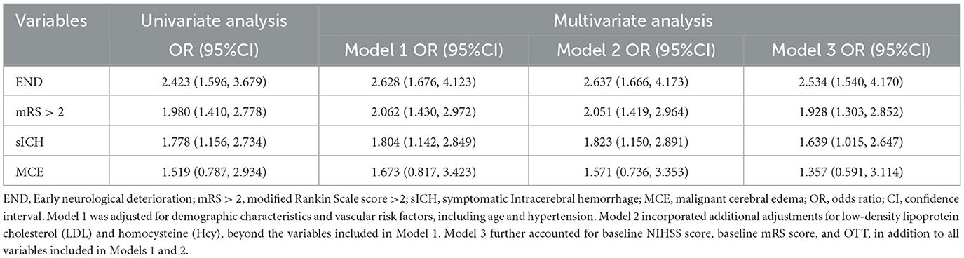 Secondary outcomes included sICH within 24 h and MCE. sICH was defined as the occurrence of imaging- confirmed HT within 24 h after onset or treatment, accompanied by a clinical deterioration characterized by an increase of ≥ 4 points in the NIHSS score from baseline (22), and was selected because it represents the most critical safety event in IVT and directly influences the risk-benefit evaluation of treatment (28). MCE was defined as brain tissue compression with midline structure displacement of ≥5 mm on imaging, accompanied by an increase of ≥2 points in the NIHSS score from baseline, the presence of consciousness disturbance, or the requirement for surgical intervention (23, 24), and was included due to its role as a leading cause of early mortality and disability, with reported mortality rates as high as 80% and two-thirds of survivors experiencing severe disability (29, 30).