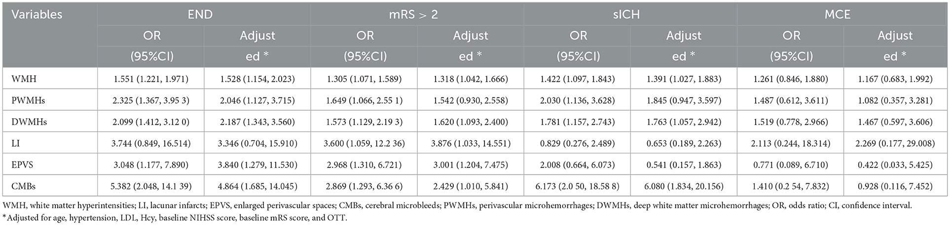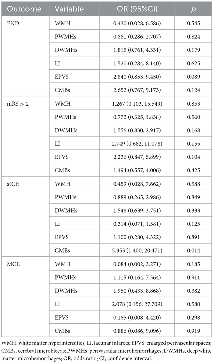 Considering the whole population, we further analyzed the association between SVD types (WMH, LI, EPVS, and CMBs) and the clinical outcomes including MCE, mRS, END, and sICH. As shown in Table 3, according to the univariate regression analysis, the LI was associated with mRS > 2 (OR = 3.600, 95%CI: 1.059–12.236), EPVS was associated with END and mRS > 2 (OR = 3.048, 95% CI: 1.177–7.890; OR = 2.968, 95% CI: 1.310–6.721), and WMH, PWMHs, DWMHs, and CMBs were also significantly associated with END, mRS > 2, and increased risk of sICH. Following univariate regression analysis, variables with significant P-values were incorporated into the multivariate regression analysis. After adjusting for confounding factors, END was found to be associated with WMH, PWMHs, DWMHs, EPVS, and CMBs, while mRS > 2 was associated with WMH, DWMHs, LI, and CMBs. Additionally, patients with CMBs, WMH, or DWMHs exhibited a significantly higher risk of sICH (OR = 6.080, 95% CI: 1.834–20.156; OR = 1.763, 95% CI: 1.057–2.942).