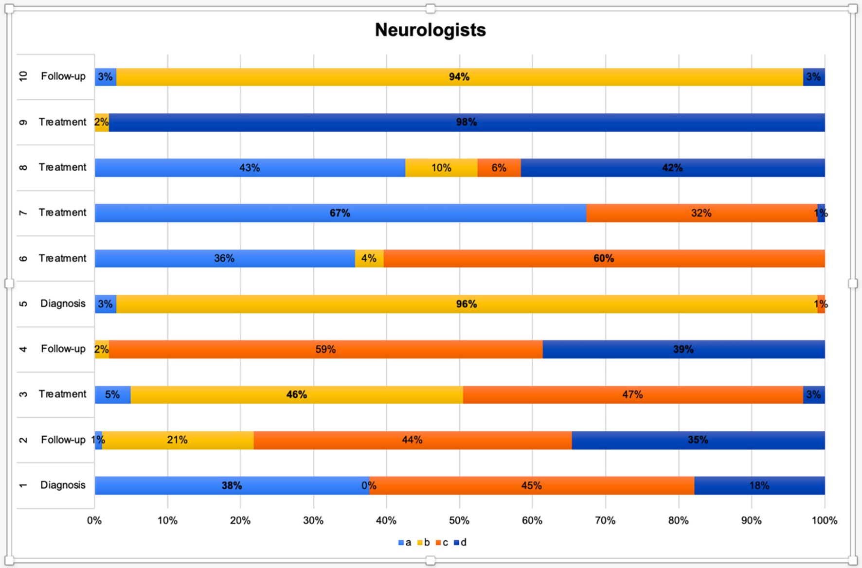This figure presents the distribution of neurologists’ responses to 10 clinical decision-making scenarios categorized under the diagnosis, follow-up, and treatment domains. Each horizontal bar represents one item (from Q1 to Q10), with stacked segments indicating the percentage of respondents selecting options a, b, c, or d. Color codes correspond to the answer choices: