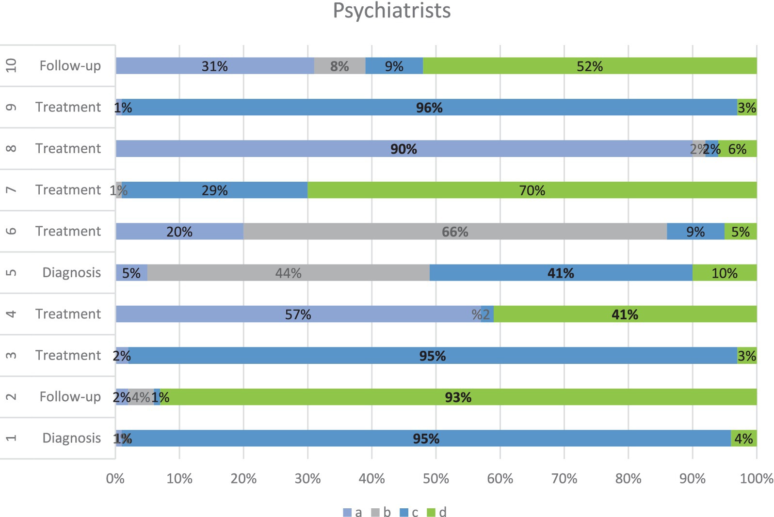 Figure 2. Distribution of psychiatrists’ responses across diagnostic, follow-up, and treatment domains.