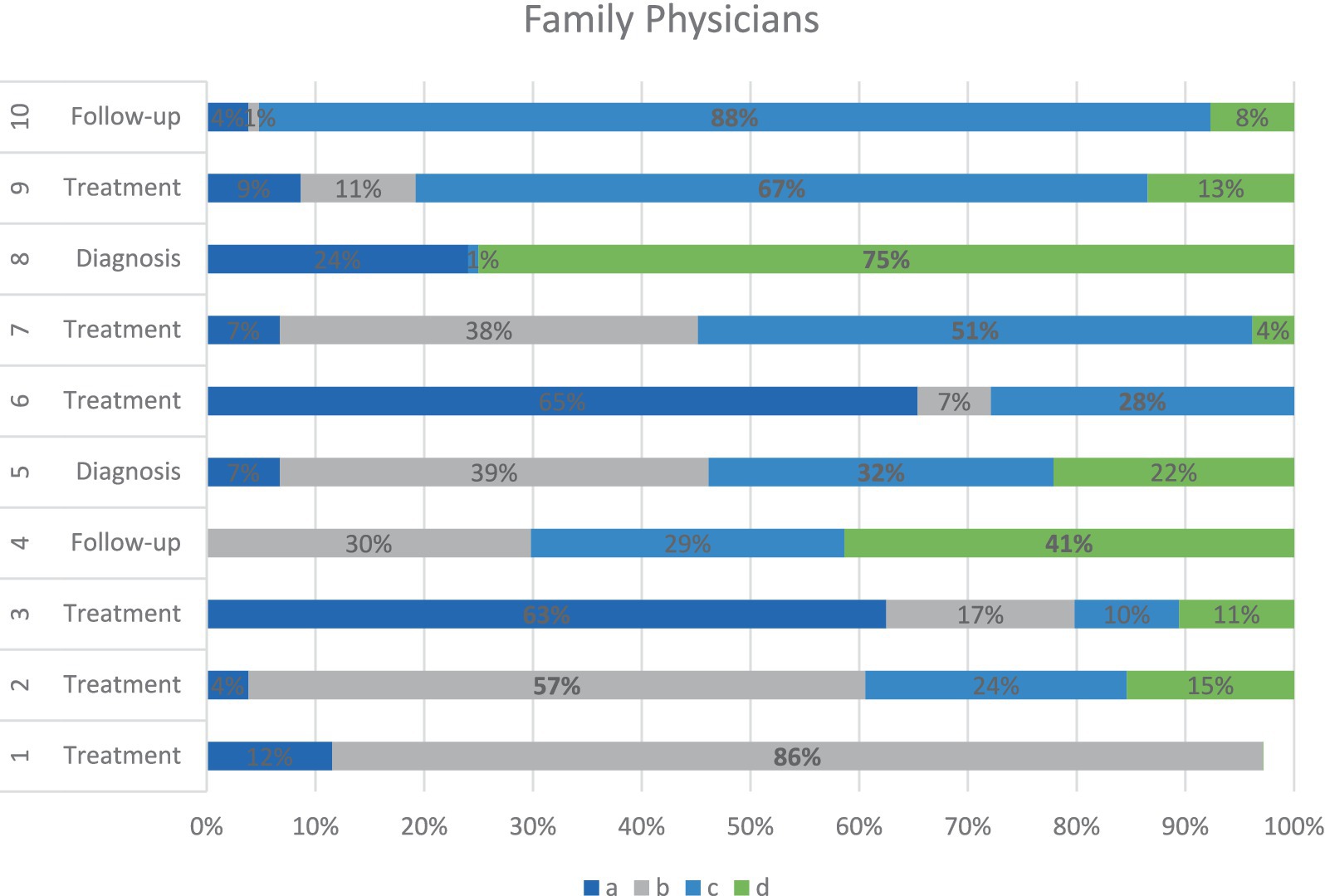 This horizontal stacked bar chart illustrates the response patterns of family physicians to 10 clinical items, classified into the diagnosis, follow-up, and treatment domains. Each bar reflects the percentage of participants selecting each of the four multiple-choice options: a (dark blue), b (gray), c (light blue), and d (green). While some questions (e.g., Q1, Q10) show dominant agreement (≥ 85%) on a single option, other questions reveal a more varied distribution, indicating greater uncertainty or divergent approaches within the group. Compared with other specialties, family physicians demonstrated the most heterogeneous patterns in treatment-related decision-making, reflecting the broad scope and referral-based nature of their clinical roles.