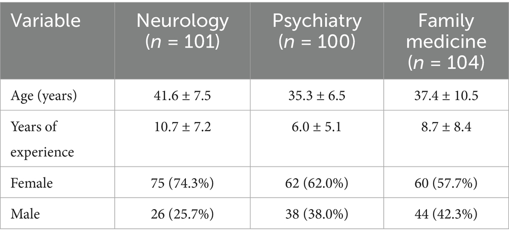 A total of 305 participants contributed to the study: 101 neurologists, 100 psychiatrists, and 104 family physicians. The sample included senior residents and attending faculty from academic hospitals and primary care centers across Türkiye.