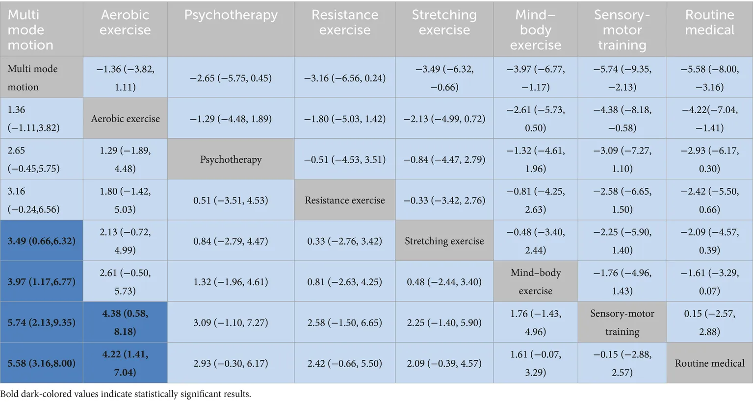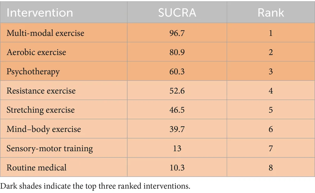 A total of 26 randomized controlled trials involving 1,408 participants were included in the analysis. The findings revealed that compared with routine medical care, multi-modal exercise significantly improved cognitive function (SMD = −5.58, 95% CI: −8.00 to −3.16), followed by aerobic exercise (SMD = −4.22, 95% CI: −7.04 to −1.41). The surface under the cumulative ranking curve (SUCRA) probabilities for the eight intervention types were as follows: multi-modal exercise (96.7%), aerobic exercise (80.9%), etc.