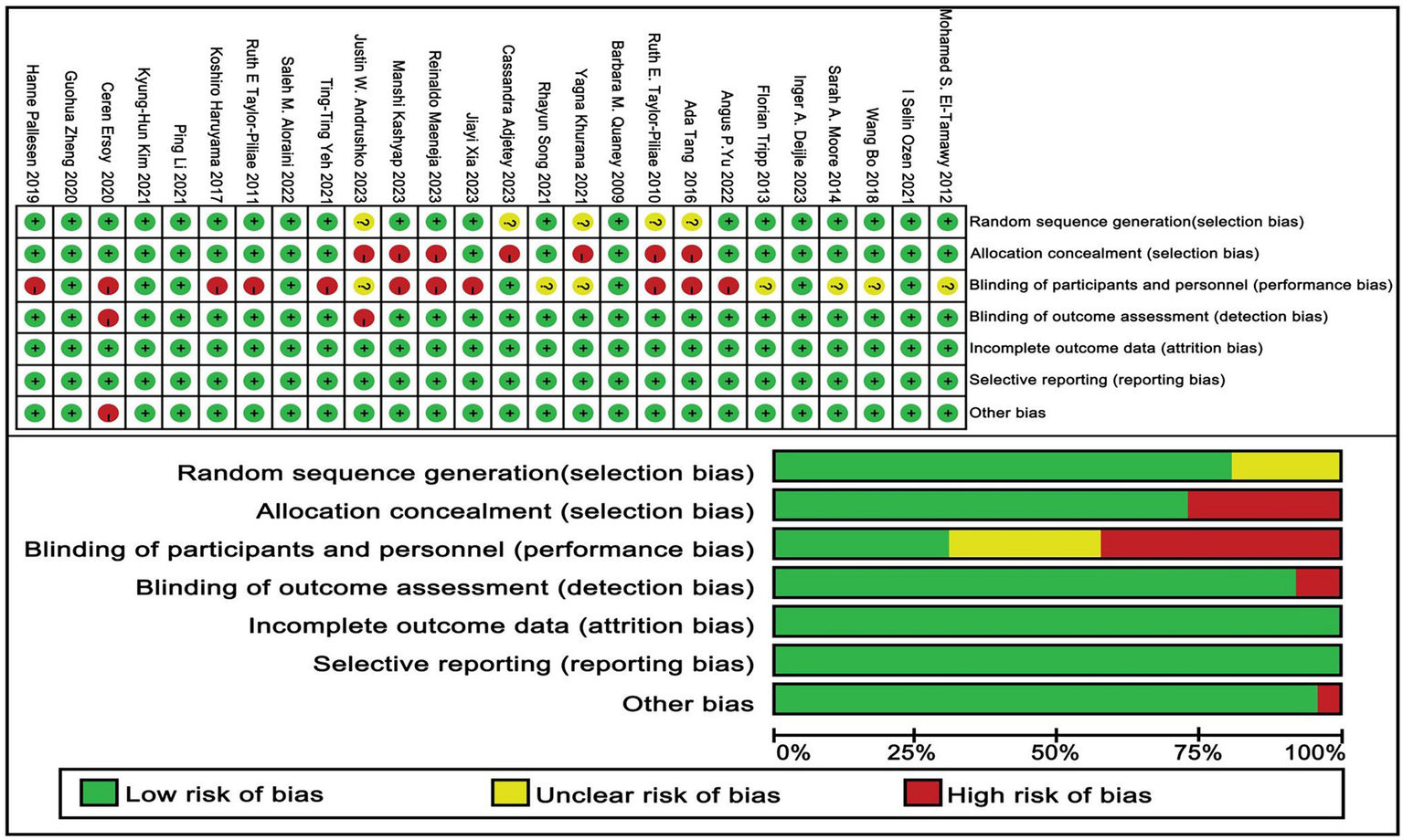 The methodologies utilized in the studies included in this analysis were evaluated through the Cochrane Risk of Bias tool, which encompasses an examination of seven essential domains: (1) the generation of random sequences (selection bias), (2) the concealment of allocation (selection bias), (3) the blinding of both participants and personnel (performance bias), (4) the blinding of outcome assessors (detection bias), (5) the management of incomplete outcome data (attrition bias), (6) the occurrence of selective reporting (reporting bias), and (7) other potential sources of bias (24, 44, 45).