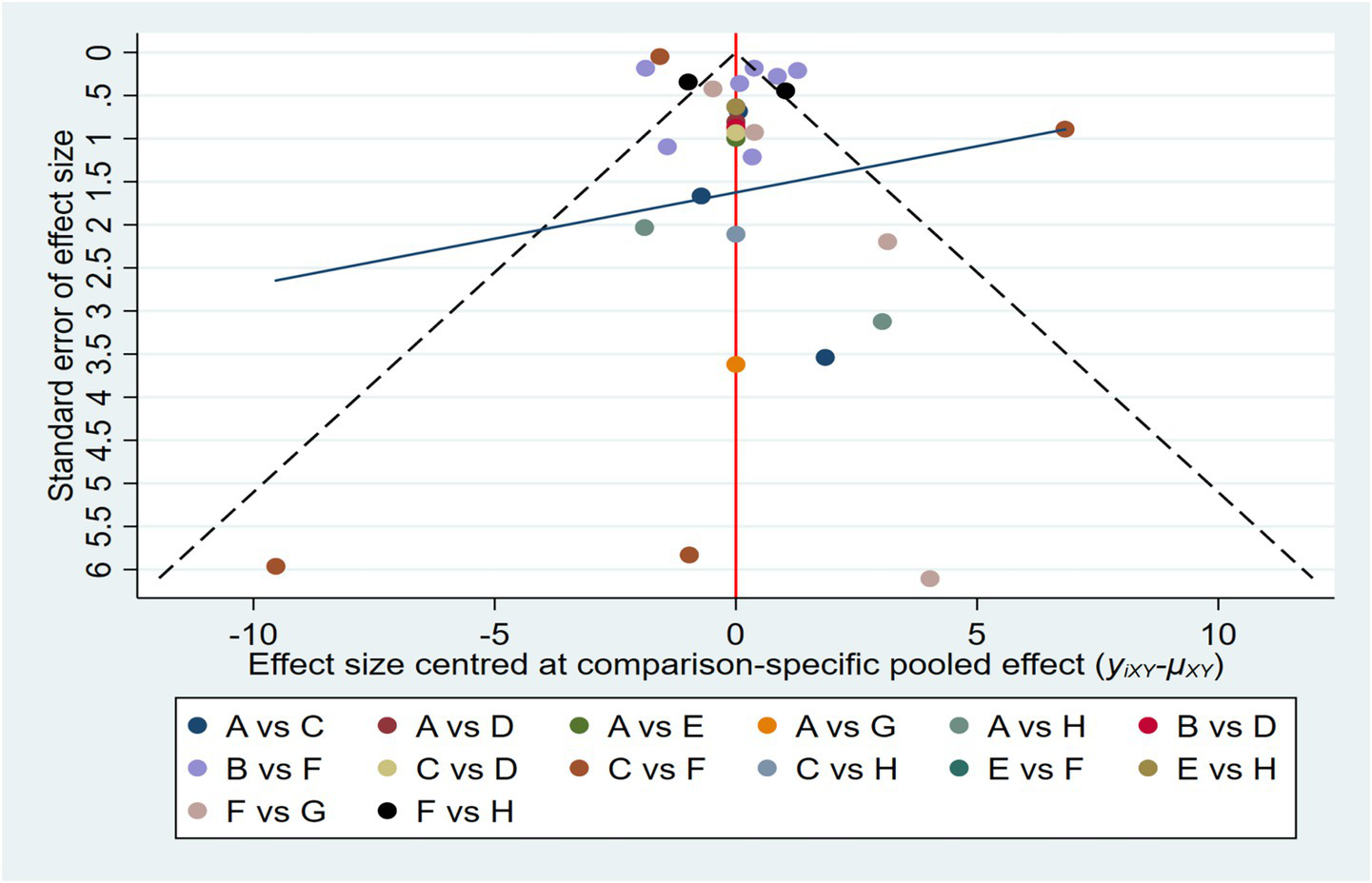 All cognitive outcome indicators were uniformly converted to Standardized Mean Differences (SMD) with directional adjustment to ensure “higher scores = improved function.” For continuous outcomes, these SMDs (and their 95% Confidence Intervals [CIs]) were calculated to establish comparability across diverse scales automatically relaxing assumptions about differences in measurement tools or populations between studies and to enable pooling of overall effects under a single random-effects model. This model, chosen for its ability to maintain consistency amid scale diversity, was also used to estimate overall differences. To assess statistical heterogeneity, we used the chi-square test p-value and I2 statistic (I2 > 50% = moderate heterogeneity; >75% = high heterogeneity). Importantly, further sensitivity analyses (with sequential exclusion of each study) did not alter effect directions, supporting the aggregation of diverse cognitive endpoints into one analytical framework. Collectively, these results indicate good homogeneity in methodology and effect directions across studies, validating the rationale for overall pooled analysis. In line with PRISMA-NMA guidelines, a frequentist network meta-analysis was conducted using maximum likelihood estimation in Stata 15.1 (46), with its “network” package generating evidence network plots (node size = sample size; line thickness = number of comparative studies). Node-splitting analysis assessed consistency by separating direct (from head-to-head studies) and indirect (via common comparators) evidence, with consistency confirmed if p > 0.05. To evaluate effectiveness, SUCRA was calculated by estimating rank probabilities, generating cumulative curves, and computing curve areas (0–100%, higher = more effective). For publication bias, we constructed funnel plots, performed Begg’s and Egger’s tests, and applied the trim-and-fill method with a random-effects model to adjust for bias impacts.
