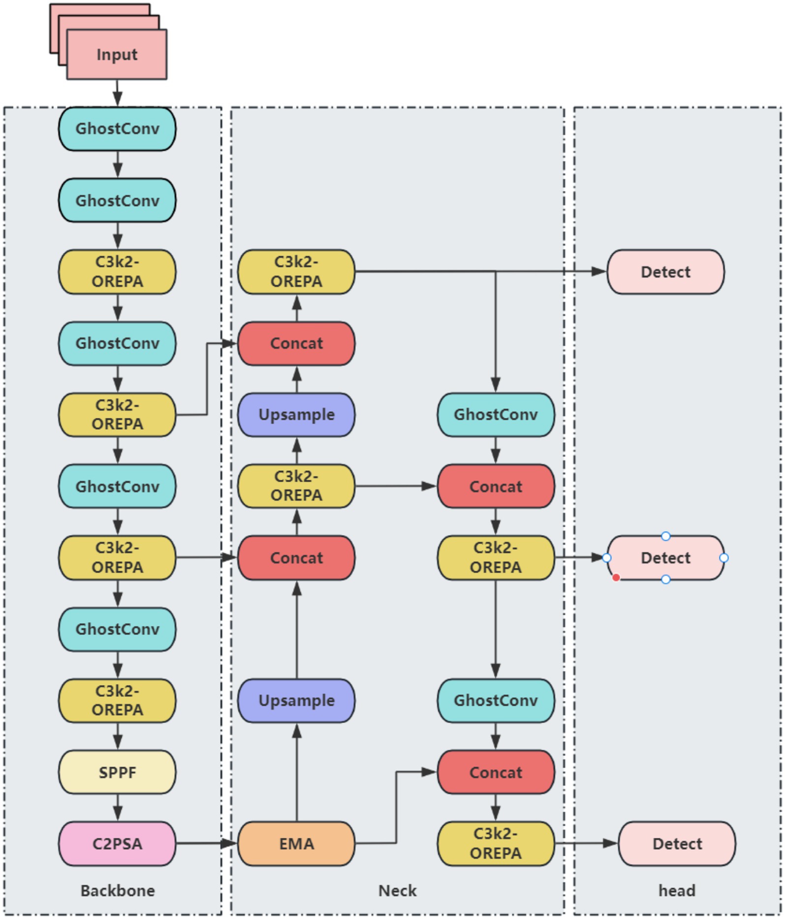 Although YOLO11 demonstrates improvements in both accuracy and speed for brain tumor detection, repeated convolution and pooling operations can compress feature maps, potentially leading to the dilution or loss of small-target features. Additionally, the anisotropic nature of brain tumor structures—including variations in shape, edge, and location—may cause YOLO11 to be biased toward negative predictions. To address these challenges and enhance both detection accuracy and efficiency, a series of improvements are proposed. Direct detection using YOLO11n alone exhibits instability, while employing larger models substantially increases computational and parameter costs. To achieve a balance between accuracy, efficiency, and model lightweighting, several modifications are applied to the YOLO11n framework. The primary improvements include: (1) replacing standard convolutions with the lightweight GhostConv module, (2) integrating OREPA to enhance the C3k2 module, and (3) incorporating the EMA attention mechanism. The resulting improved YOLO11 network architecture is illustrated in Figure 2.