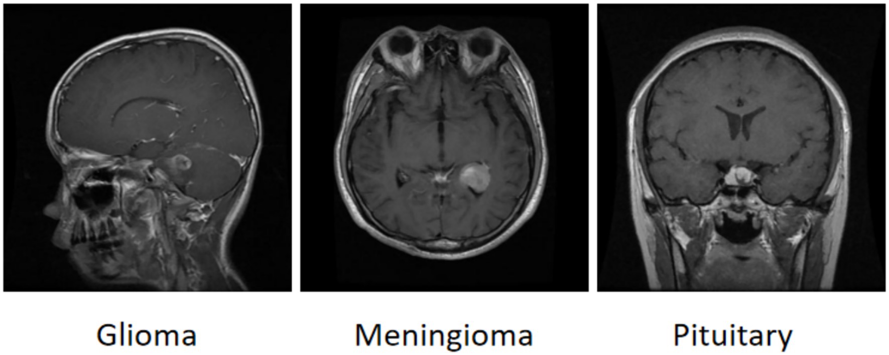 Brain tumor is the irregular growth of cells in the brain or its surrounding tissues, brain tumor has strong proliferation, when it occupies a certain space, it will constantly compress the surrounding tissues, and then damage the central nervous system, threatening patients’ lives (1, 2). Glioblastoma is the most common and aggressive malignant brain tumor, with abnormal cell proliferation that can lead to increased intracranial pressure and progressive neurological dysfunction. Recent data shows that despite combined treatment with surgery, radiotherapy, and temozolomide, the five-year relative survival rate remains extremely low, at only approximately 5% (3). In this critical context, early and precise identification of tumor subtypes, including highly aggressive gliomas, benign but recurrent meningiomas, and pituitary tumors with insidious growths, is of decisive clinical significance for the development of personalized surgical protocols, precise planning of radiotherapy targets, and assessment of prognosis. Magnetic resonance imaging (MRI) has become an irreplaceable tool for the diagnosis of brain tumors by virtue of its multi-sequence imaging capability (e.g., T1-weighted, T2-weighted, FLAIR, and DWI sequences), sub-millimeter spatial resolution, and absence of ionizing radiation (4, 5). However, brain tumor MRI diagnosis also faces multiple challenges. At the level of image quality, the signal-to-noise ratio of images is significantly reduced due to patient autonomous motion, magnetic field inhomogeneity, and radiofrequency coil coupling noise. Morphologically, the three main types of tumors are highly heterogeneous, with gliomas often presenting as “butterfly-shaped” infiltrative growth with cystic necrosis in the white matter region, with blurred boundaries with the surrounding edema zone; meningiomas mostly present as homogeneously reinforced masses attached to the wide base of the dura mater, with a typical “rat-tail sign”; and pituitary tumors are hidden in the pyriform region, which are prone to wrapping around the carotid artery and compressing the optic crossroads (6, 7).