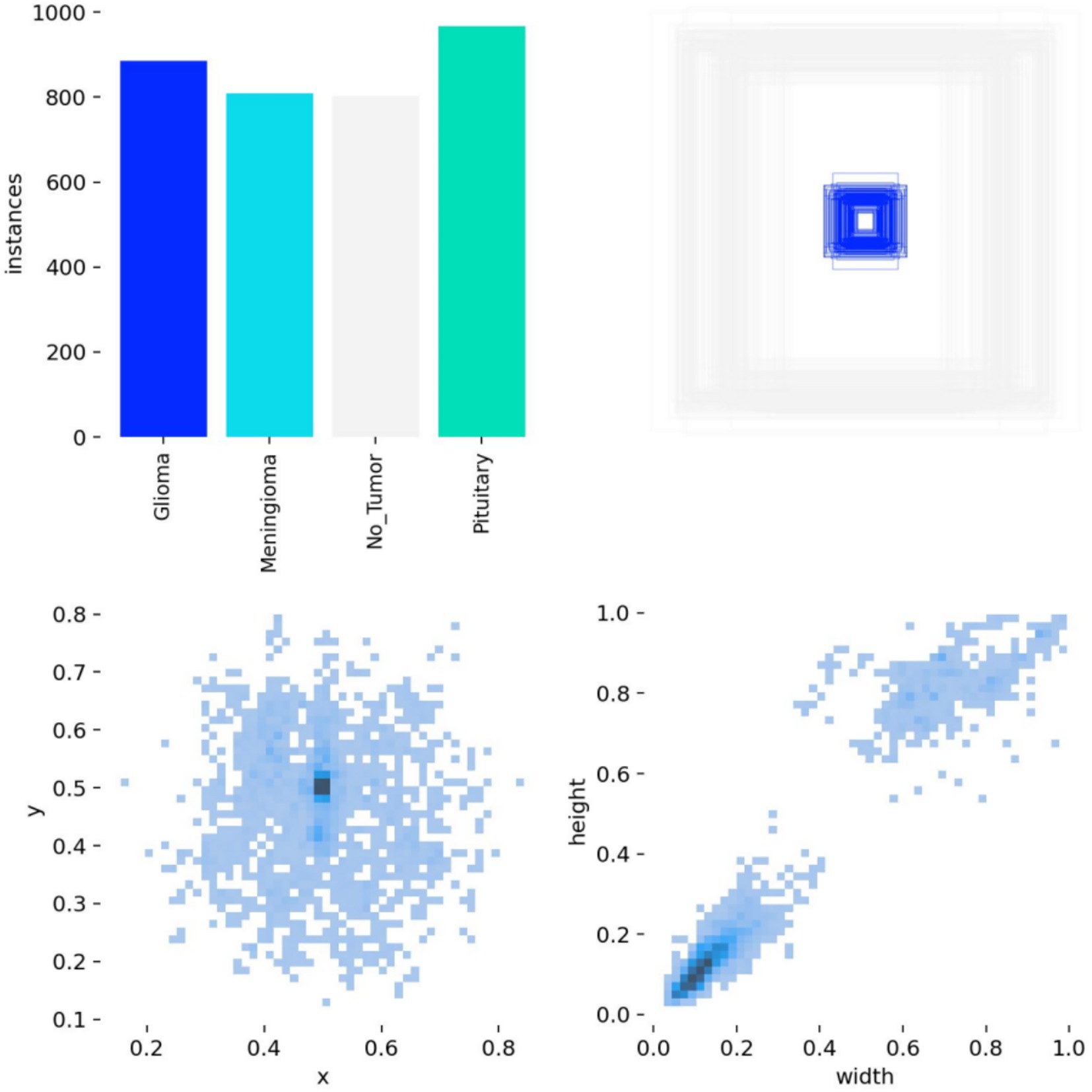 The brain tumor classification data used in the experiments were obtained from two publicly available Kaggle datasets. The first dataset (28) was manually filtered to select 4,000 brain MRI images, which were categorized into four groups: glioma, meningioma, pituitary tumor, and no tumor (1,000 images per category). This dataset, referred to as Dataset 1, was used for model training and internal testing. The second dataset (29) contained 20 MRI images per category, totaling 80 images, and served as an external test set, referred to as Dataset 2. All images were annotated in advance by two attending radiologists with over 5 years of experience using the Labeling tool, and the annotations were subsequently reviewed by two senior radiologists with more than 10 years of experience to ensure accuracy. Annotation information was stored in txt format, and all images were resized uniformly to 640 × 640 pixels. Dataset 1 was divided into training, validation, and test sets in an 8:1:1 ratio to guarantee both sufficient training samples and reliable evaluation of model performance. Examples of training samples from Dataset 1 are presented in Figure 7, while the annotation distribution and inter-category correlations are illustrated in Figures 8, 9.