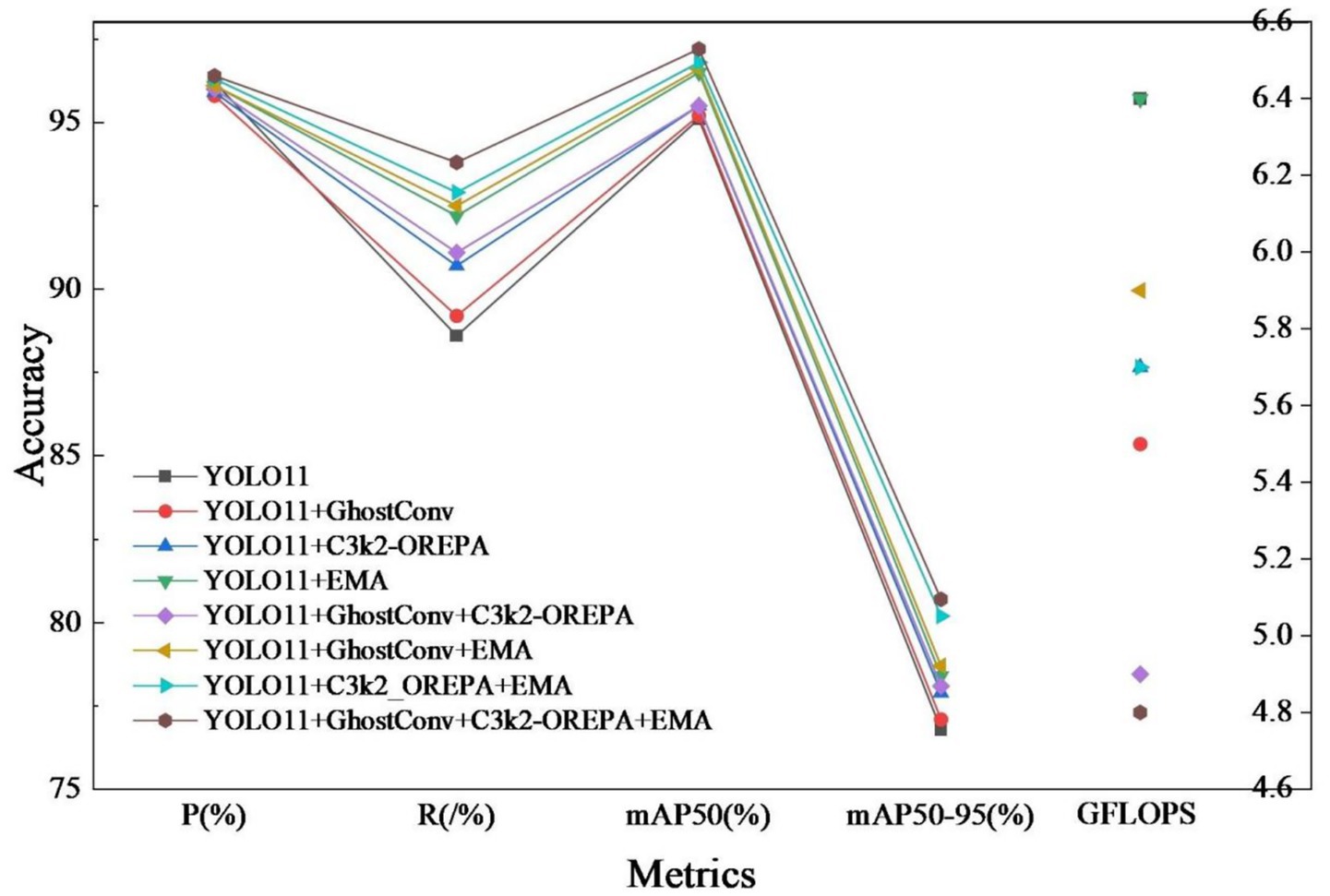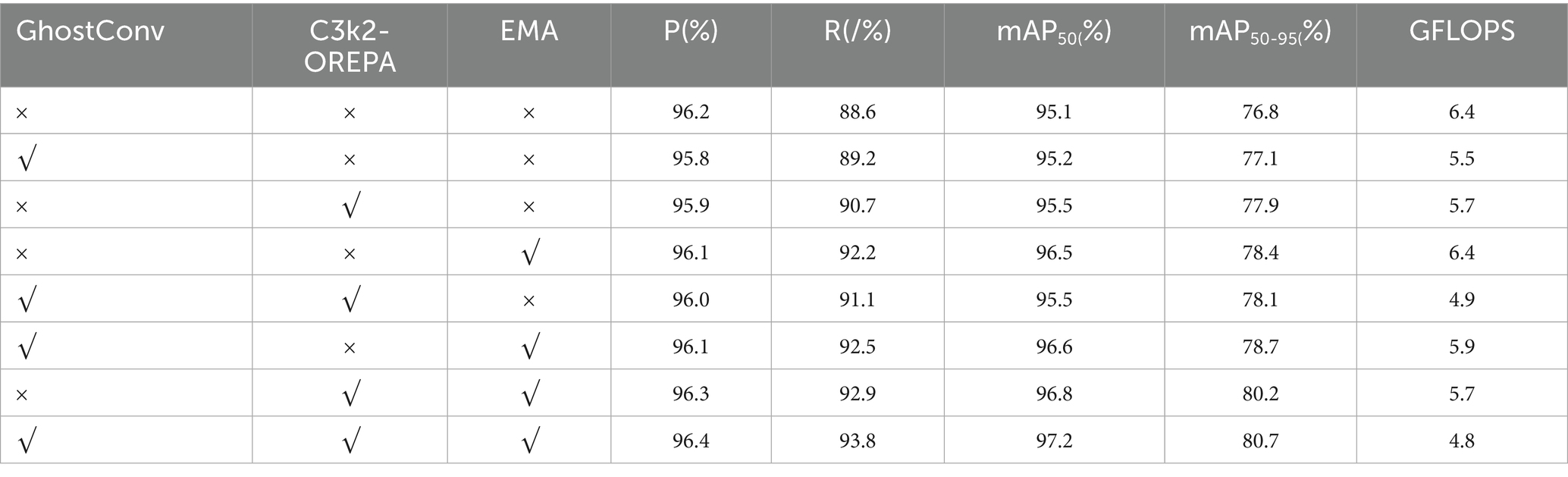 In order to verify the effectiveness of each improvement strategy, a systematic ablation experiment was conducted based on YOLO11n, and the experimental results are shown in Table 3. The experimental results show that each improvement module significantly improves the detection performance of the model on the target.