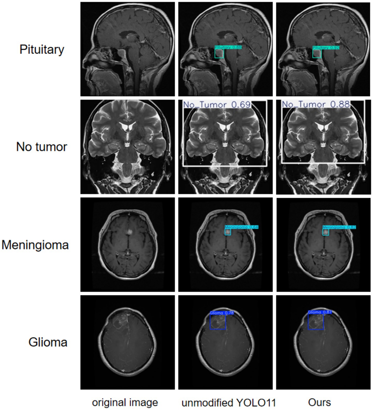 A more intuitive view of the effects before and after the improvement can be seen in the original and detection result plots randomly selected from the internal and external test sets, see Figures 13, 14. Each line compares the effects of a brain tumor type before and after detection and before and after the model improvement, with the original plot, the original YOLO11n detection result plot, and the improved YOLO11n detection result plot, in order from left to right. The text on the left side above the target box in the detection result plots is the brain tumor type, and the number on the right side is the detection confidence level. Column 3 of both Figures 13, 14 show that the improved model can detect gliomas, meningiomas, pituitary tumors, and no tumors (entire brain region) with high confidence. Table 5 shows the quantitative results of the detection performance for various categories of the improved model in the external test set.