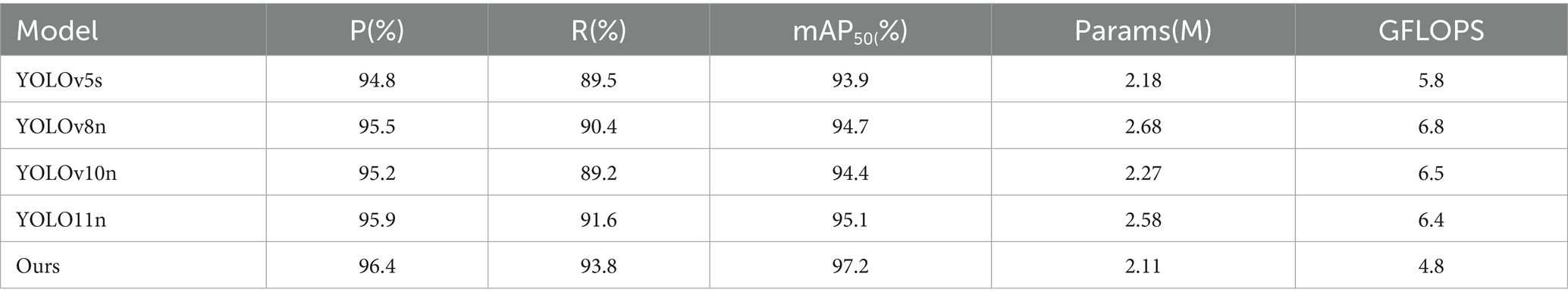 In order to highlight the performance of the improved algorithm in this paper, other algorithms of the YOLO series of the same magnitude as the YOLO11n model are selected for comparison tests under the same experimental environment, and the obtained experimental results are shown in Table 4. According to the data in the table, in terms of precision, mAP50 as a key indicator for evaluating the comprehensive performance of the model, the mAP50 value of the improved algorithm reaches the highest among the comparative algorithms, 97.2%, which is an increase of 2.1 percentage points on the basis of the original model, and the recall rate of this paper’s algorithm reaches 93.8%, which is the same as the highest value of all the comparative models, and it is a rise of 2.2 percentage points compared with the original model. This paper’s algorithm also reduces the number of parameters and computational complexity while improving precision, reducing the number of parameters by 0.47 M and the complexity by 1.5 GFLOPS compared with the original model.