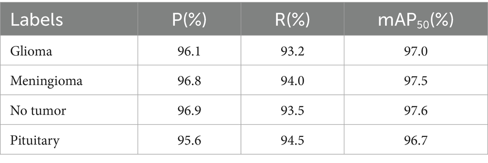 In brain tumor detection tasks, high recall is of primary clinical importance to ensure that no suspicious tumor regions are missed. Even if the model possesses high precision, a low recall may result in certain tiny or ambiguous tumor lesions being overlooked, with serious consequences. However, simultaneous enhancement of precision is equally crucial, as it is directly related to the accuracy of target localization and classification, which not only significantly reduces the possibility of misclassifying non-tumor normal tissues as tumor categories and reduces unnecessary patient anxiety and invasive examinations for non-tumor lesions, but also provides clinicians with a reliable AI-assisted basis for quickly and accurately identifying tumor subtypes. This high-precision classification result is a critical first step in the development of personalized treatment plans, it directly determines whether the patient should be prioritized for surgical resection, radiotherapy, chemotherapy, or conservative observation and follow-up, which helps to direct the patient to the most appropriate diagnostic and therapeutic pathway at the early stage of the disease, and avoids delays in treatment or inappropriate choices of treatment due to misdiagnosis or ambiguity in classification. At the same time, clear information on the tumor category also provides important reference information for the subsequent estimation of the difficulty of surgery, the need for multidisciplinary collaboration, and the prediction of the sensitivity of radiotherapy, laying the foundation for more detailed diagnostic and therapeutic steps.