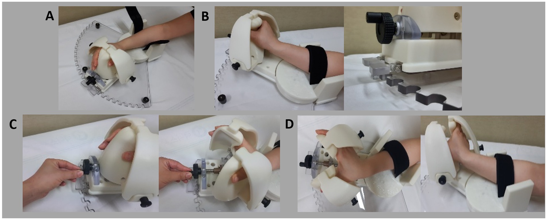 Figure 1. Illustration of device usage. (A) Initial setup: Place the patient’s wrist and hand into the device and secure the forearm with Velcro tape. (B) Stretch the wrist by rotating the wrist module and locking it in place. (C) Stretch the fingers by rotating the wheel. (D) Final target position: Fully extended wrist and fingers.