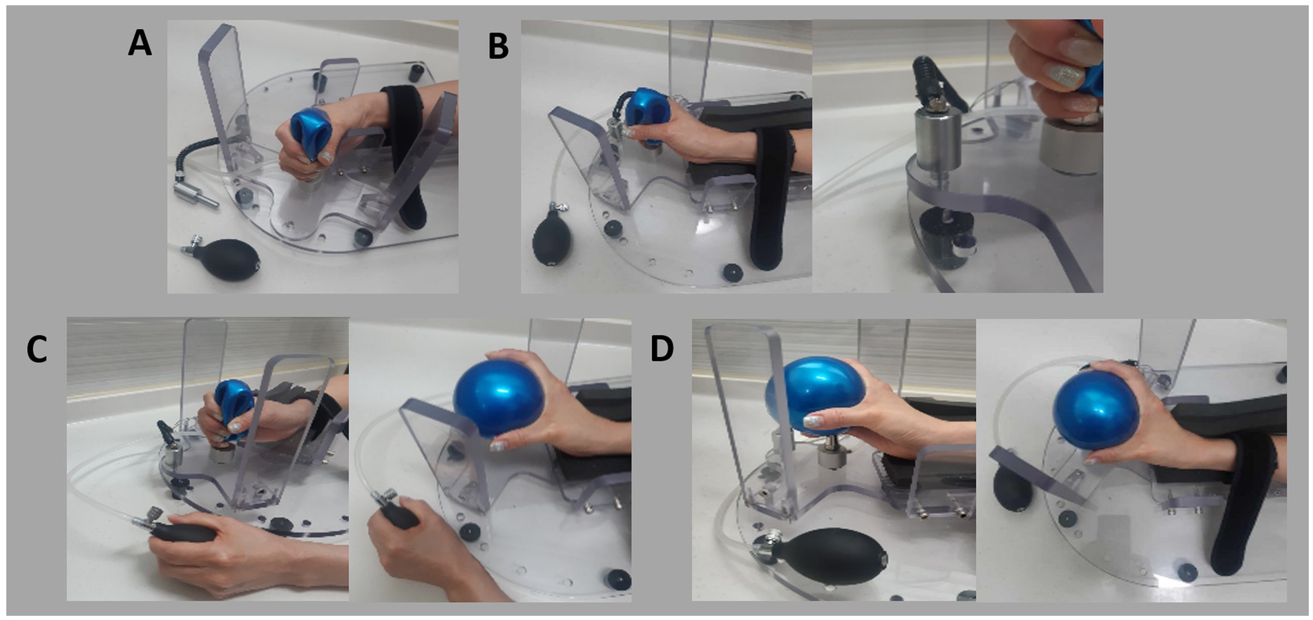 Figure 4. Steps for using the newly developed device: (A) Initial setup: Position the patient’s hand in the device and secure the forearm with Velcro tape. (B) Stretch the wrist by rotating the wrist module and locking it in place. (C) Stretch the fingers by inflating the ball using the cuff. (D) Final target position with extended fingers and wrist.