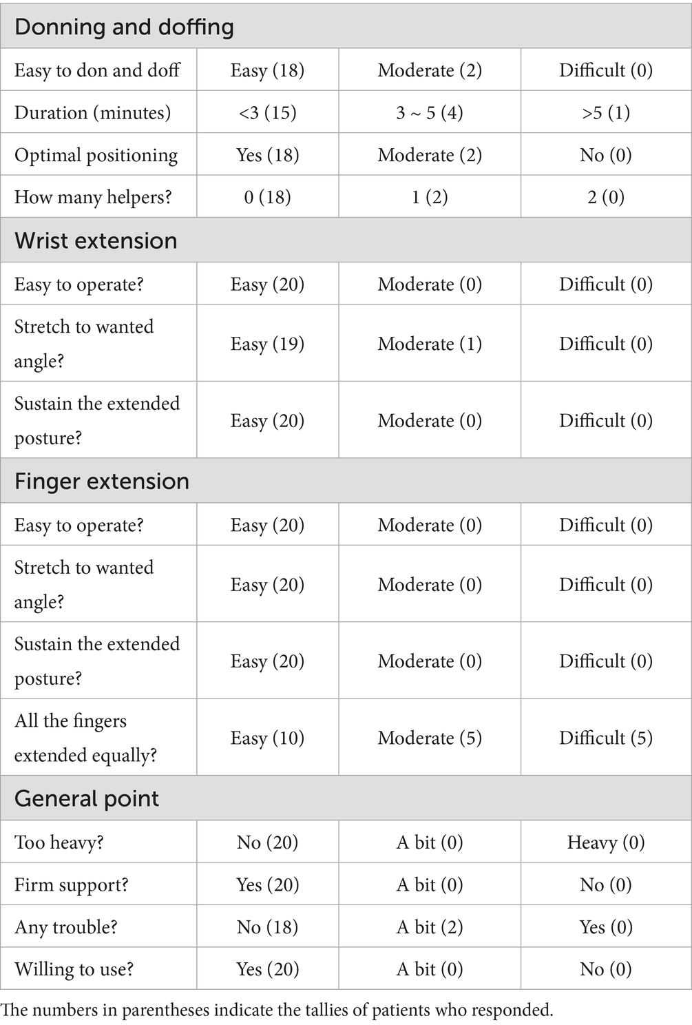 Previous efforts to develop stretching devices for managing hand spasticity have been made (17–20). However, these devices were limited in their ability to control spasticity in the fingers without addressing wrist spasticity. Additionally, earlier devices often required assistance for donning and operation, limiting their practicality for independent use. In contrast, our device addresses spasticity in both the fingers and wrist and is designed for independent use by the patient. This independence allows patients to use the device as frequently as needed, facilitating more consistent management of spasticity. Feedback from our patient survey further highlighted the device’s ease of use, including its straightforward donning and doffing process, user-friendly module manipulation, and portability.