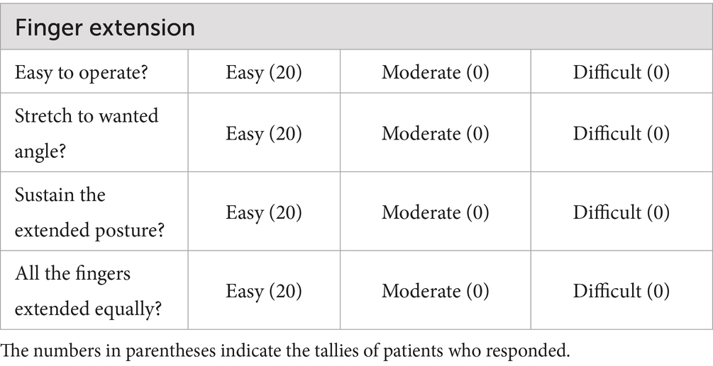 In its resting state, the ball remains deflated, allowing the metal upright pole to support the spastic hand as it fits into the finger module. When the cuff is used to inflate the ball, the expanding ball stretches the spastic hand and fingers (Figure 4). We applied the upgraded device to all 20 patients and reassessed the user feasibility, specifically focusing on finger extension (Table 2). Following the upgrade, all patients reported that all fingers were equally and easily extended. Additionally, all patients indicated that they could easily operate the device, achieve the desired angle of extension, and maintain the extended posture.