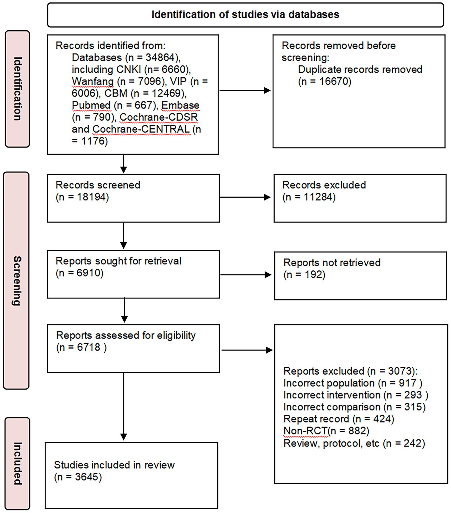 In total, 34,863 literature items were retrieved (Figure 1). A total of 18,194 articles remained after duplicates were removed. From the title and abstract, 11,284 articles were removed for not meeting the inclusion/exclusion criteria, and 192 articles were not available. After reading the full text, 3,073 articles with repeated publications and PICO information that did not meet the requirements were excluded. A total of 3,645 articles were selected for the final analysis (14).