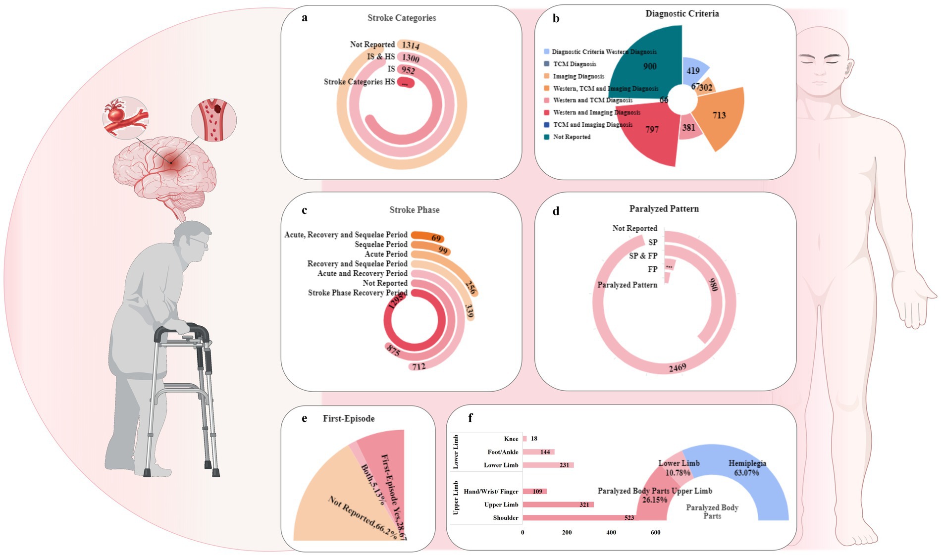 Figure 3. Population characteristics of the selected RCTs. (a) Stroke categories included in the research. (b) Reporting status of diagnostic criteria. (c) Stroke phases. (d) Paralysis patterns included in the studies. (e) First-episode status of the included RCTs. (f) Proportion of paralysed body parts. SP, spastic paralysis; FP, flaccid paralysis; IS, ischaemic stroke; HS, haemorrhagic stroke; TCM, traditional Chinese medicine.