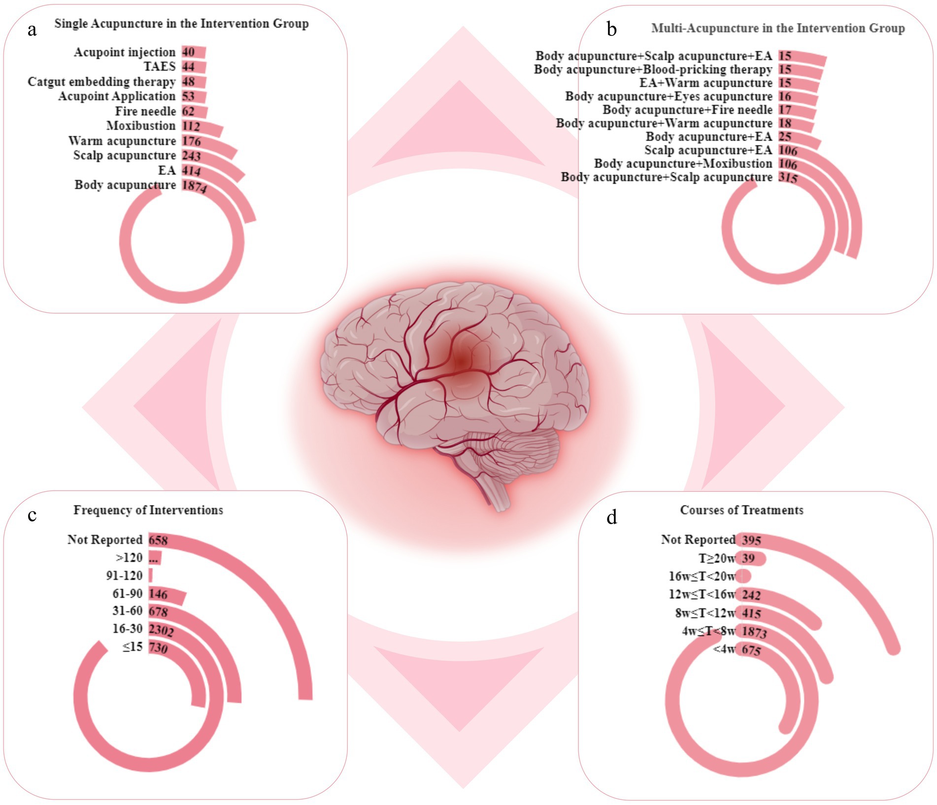 We counted single and multiple acupuncture treatments separately and found that the top five acupuncture therapies were body acupuncture, electroacupuncture (EA), scalp acupuncture, warm acupuncture, and moxibustion (Figure 5a). The top five multi-acupuncture therapies were body acupuncture combined with scalp acupuncture, body acupuncture combined with moxibustion, scalp acupuncture combined with EA, body acupuncture combined with EA, and body acupuncture combined with warm acupuncture (Figure 5b). The total frequency of treatment in most studies was <30, which was related to the intervention method adopted by the institutes. When acupoint embedding or injection was used, the number of treatments was significantly lower than that for body injection interventions (Figure 5c). The treatment course for the acupuncture intervention was mostly between 4 and 8 weeks (1,873/3,645, 51.89%; Figure 5d). Detailed information is provided in Supplementary materials 2, 3.