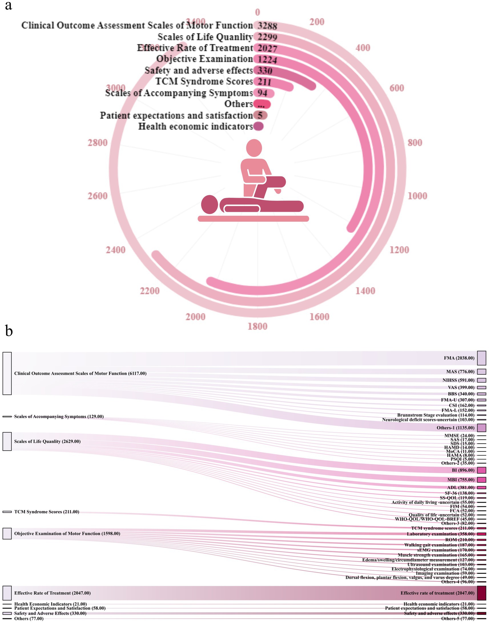 Figure 7. Outcome characteristics of selected RCTs. (a) Number of articles reported for each indicator category. (b) Morus chart on the left represents the eight categories, and that on the right represents the specific indicators under the categories. FMA, Fugl-Meyer motor assessment; MAS, Modified Ashworth Scale; NIHSS, National Institutes of Health Stroke Scale; VAS, Visual Analog Scale/Score; BBS, Berg Balance Scale; CSI, composite spasticity index; MMSE, mini-mental state examination; SAS, Self-rating Anxiety Scale score; SDS,self-rating depression scale; HAMD, Hamilton Depression Rating Scale; HAMA, Hamilton Anxiety Scale; MoCA, Montreal Cognitive Assessment Scale; PSQI, Pittsburgh Sleep Quality Index; BI, Barthel Index; MBI, Modified Barthel Index; ADL, activities of daily living; SF-36, Quality of Life-36; SS-QOL, stroke-specific quality of life; FIM, functional independence measure; FCA, functional capacity assessment; WHOQOL-BREF, World Health Organization Quality of Life Brief Scale; TCM, traditional Chinese medicine.