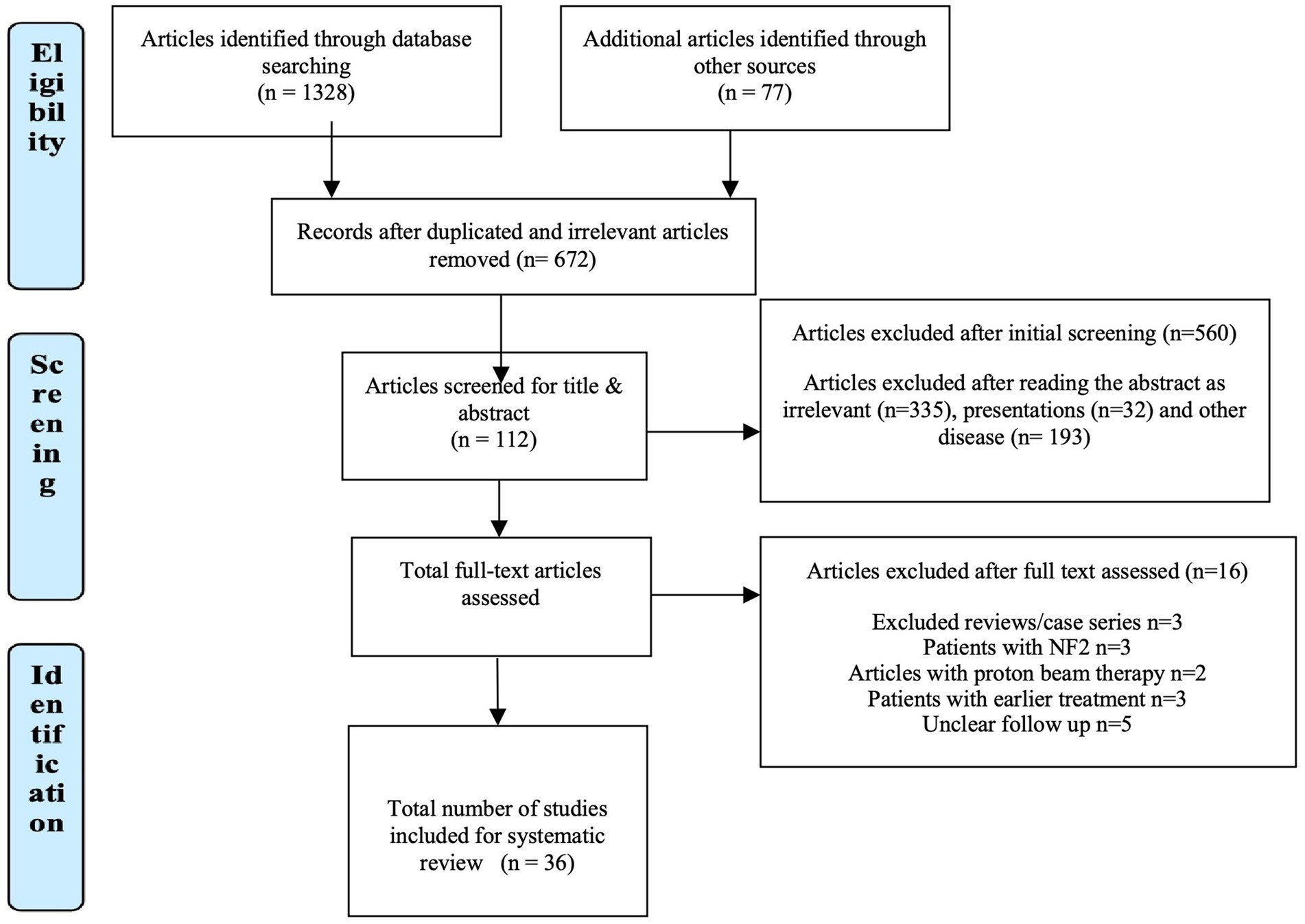 A condensed summary of the included studies, highlighting essential variables such as author, year of publication, sample size, radiotherapy technique, and reported hearing preservation rate. Full methodological and clinical details, including tumor size, fractionation, marginal dose, and secondary outcomes, are provided in Supplementary Table S1 for reference. A total of 1,328 articles were obtained after an electronic search through databases (PubMed, Cochrane) by the use of relevant keywords, in the last decade (2011–2020). Apart from this, 77 other articles were identified from different sources, such as the bibliography of relevant articles. Therefore, a total of 1,405 articles were then screened for duplication. Seven hundred thirty-three articles were removed from the list due to duplications, after which we were left with 672 articles. Out of 672, 560 articles were removed owing to irrelevance (n = 335), presentations (n = 32), and other diseases (n = 193). After excluding these articles that did not fulfill the inclusion criteria, 112 were left for inclusion. Out of 112 articles, only 52 were full-text and were further selected.